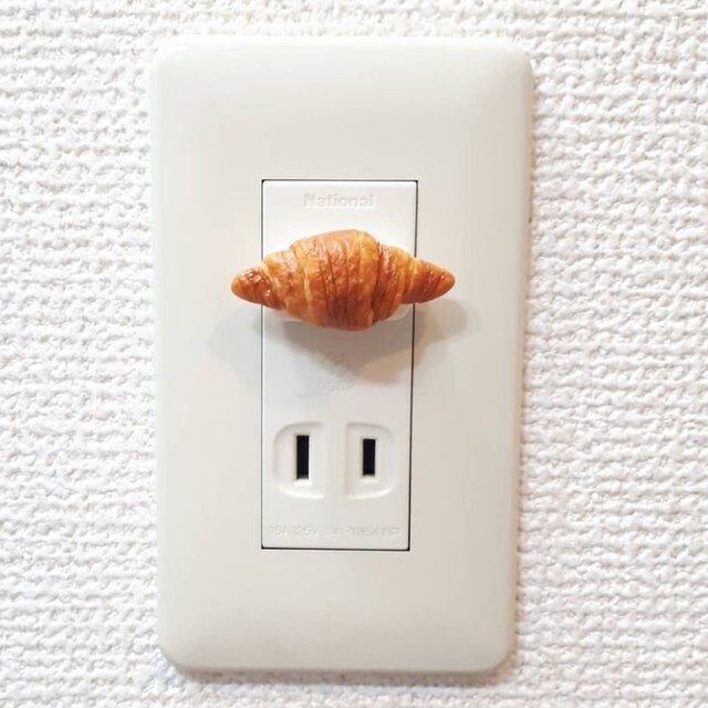 コンセントキャップはほこり防止で使用しますが、インテリア感覚で使っていないコンセントに差すのも可愛い🥐 メロンパン、クロワッサン、ソーセージロールなどいろんな種類があります🍞 minne.com/items/27117972