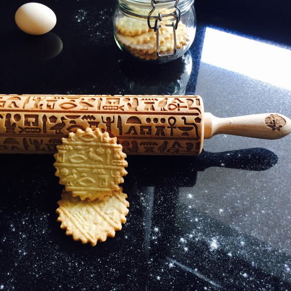 神聖文字がレーザー彫刻されたローラー式めん棒なので、ユニークな模様の焼き菓子を作れます🍪 めん棒の素材はブナの木を使用🌳 creema.jp/item/5490558/d…