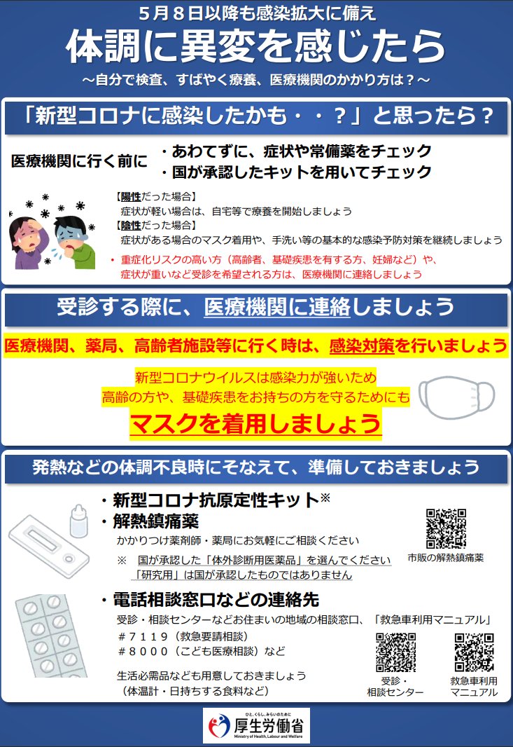 あわてず症状などを確認、国が承認したキットを用いてチェックしましょう。高齢の方など重症化リスクの高い方や、症状が重い方は医療機関にご連絡ください。自治体の電話相談窓口も継続しているので、ご活用ください。
