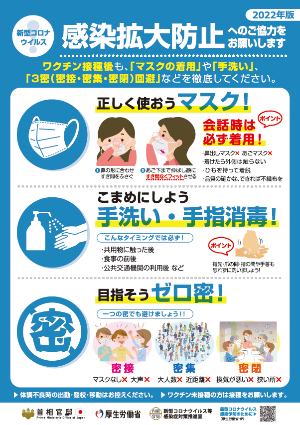 感染力が強い変異株にも基本的な感染予防策が有効です。「正しいマスクの着用」や「こまめな手洗い」、「三つの密」の回避、「換気」などの感染対策の徹底にご協力をお願いします。