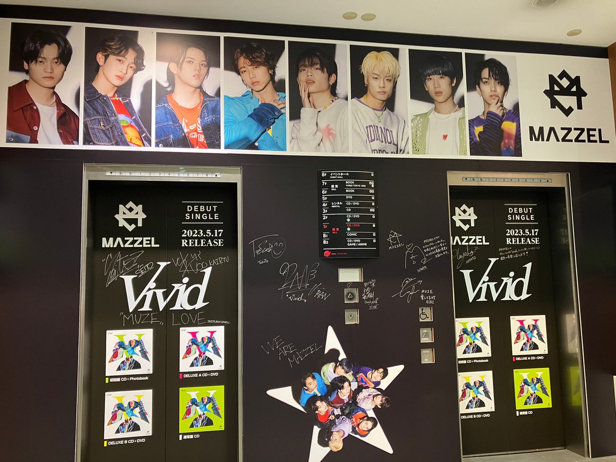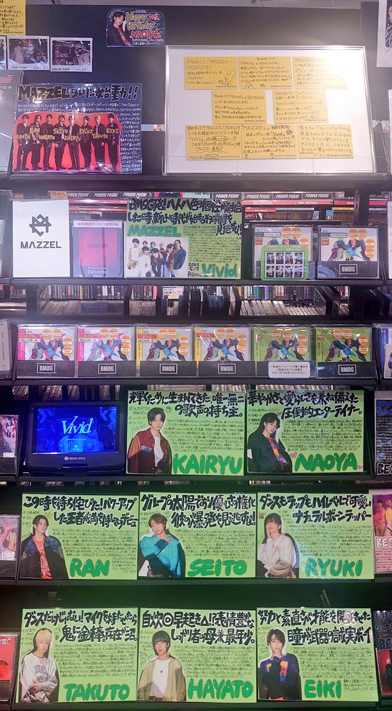 デビューシングル『Vivid』をリリースしたMAZZELの皆様がシブツタに降臨😭💕コメントカードやポスターに加え、店内にたっぷり足跡残して頂きました🪄お忙しい中、ご来店ありがとうございます✨8人の魅力が凝縮された必聴の1作!是非チェックしてみてください💚