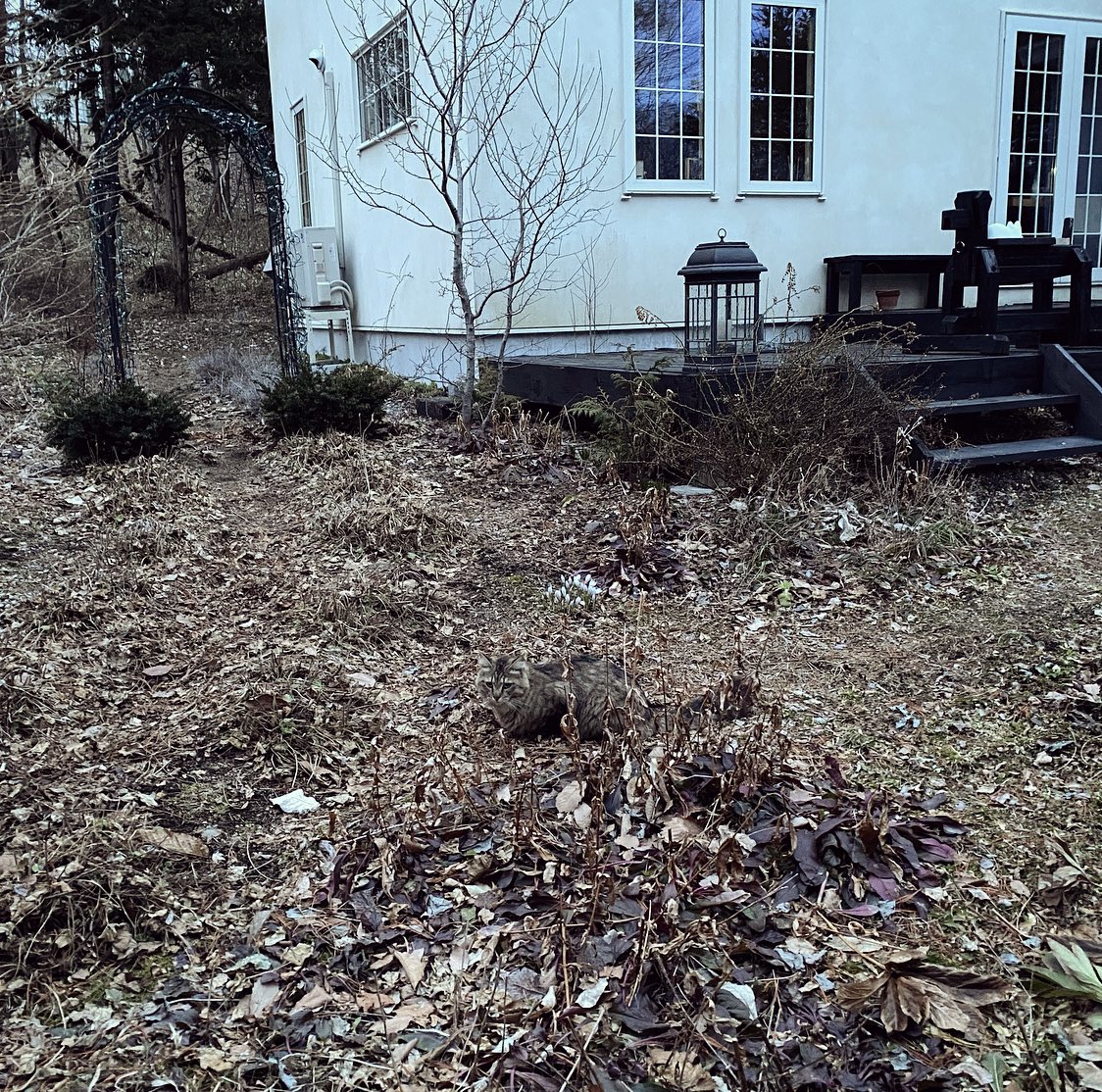 小川を流れていく枯葉を追いかける猫。