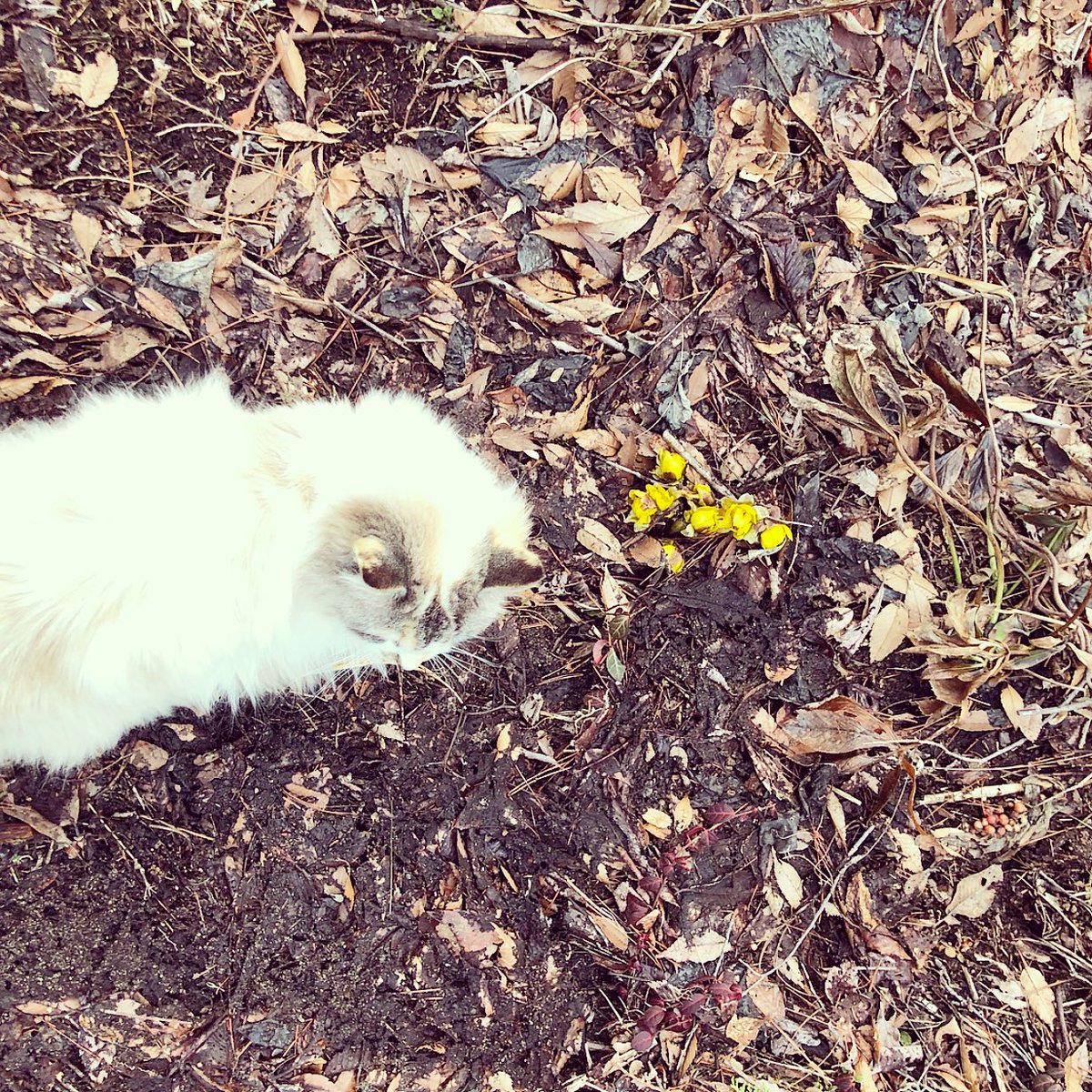 日当たりのいい所では福寿草がたくさん咲き始めました。iPhoneのアルバムを辿っていると、ちょうど同じ時期に同じような写真を撮っていたのを見つけました。一年前のビビはまだ小さくて、こげ茶の猫でした。