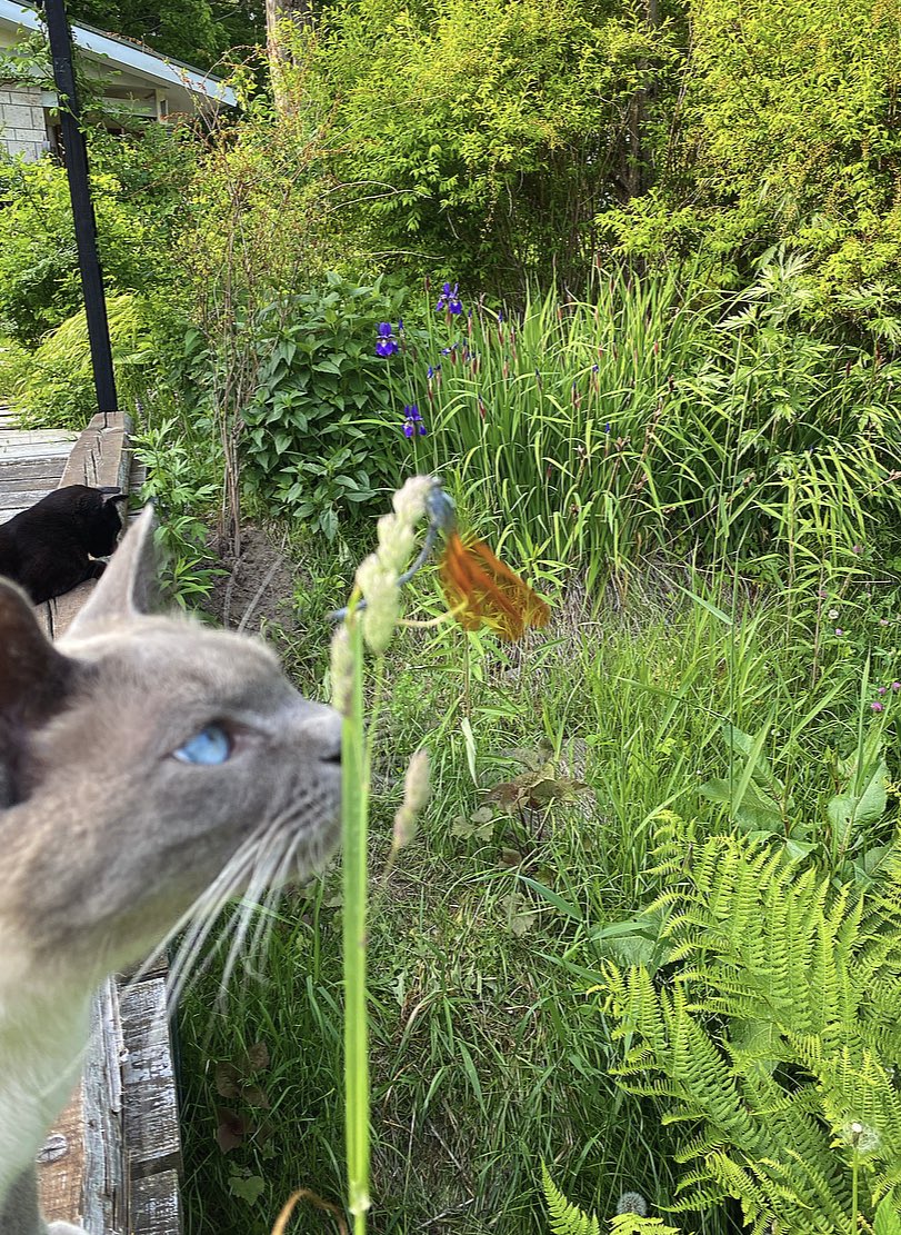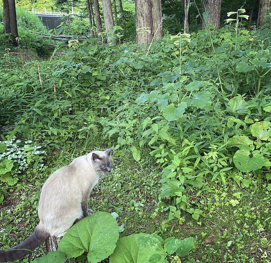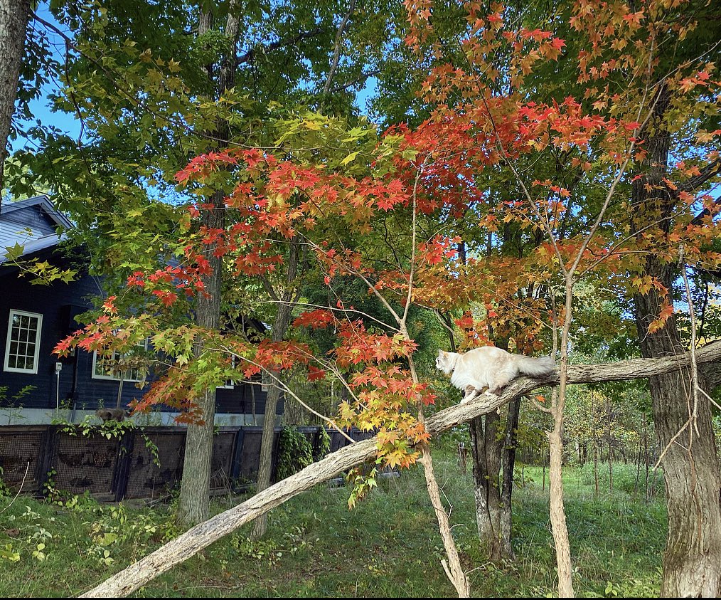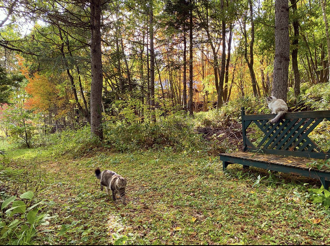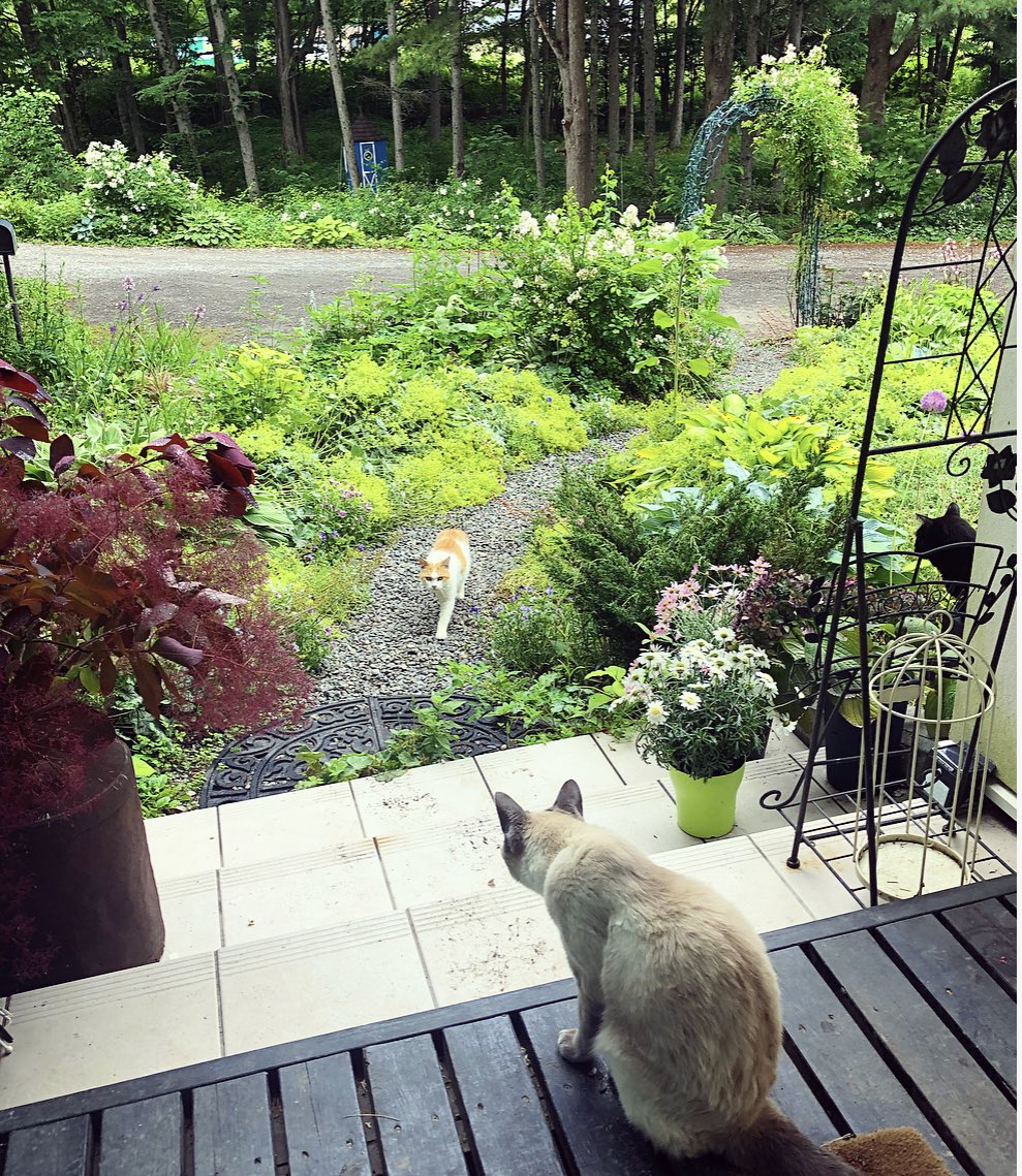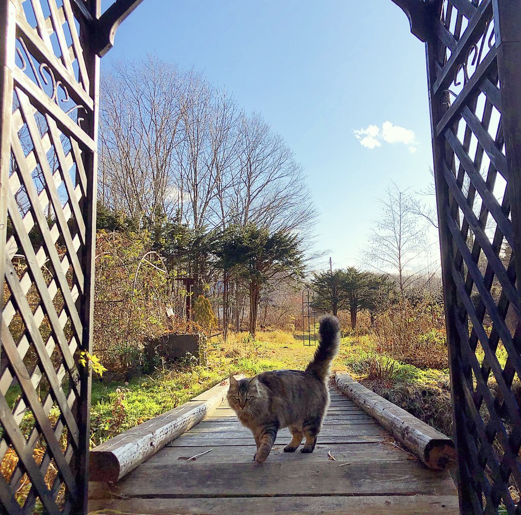 いいお天気でした。お隣の母屋から私の家までお散歩にやって来た白茶さんをお迎えするボンボン。