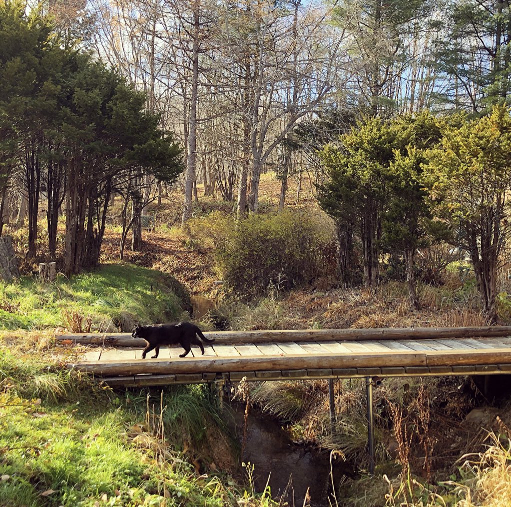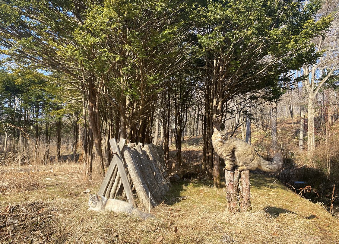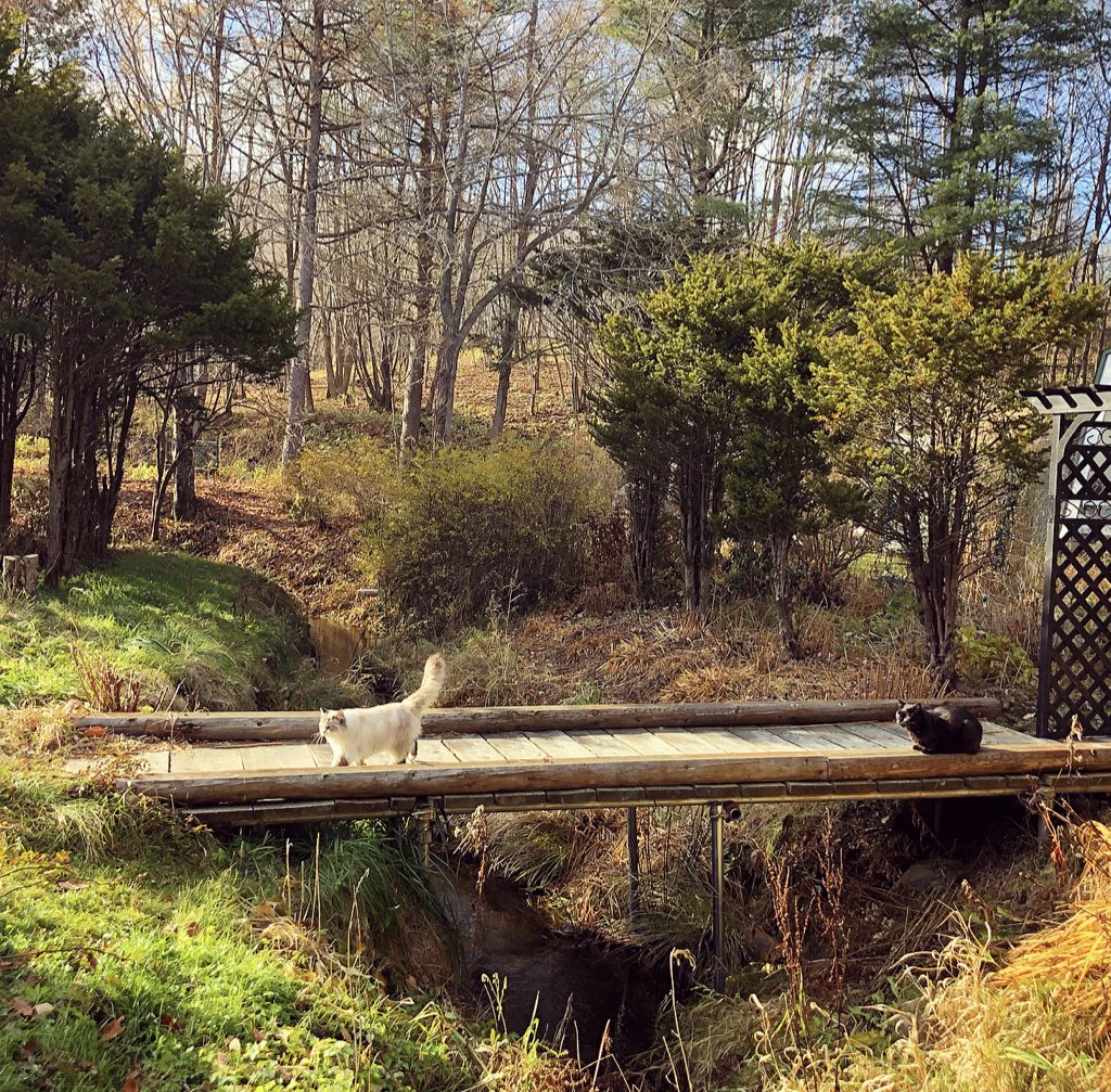少し気温が上がった日。母屋前の小川にかかる橋は猫たちお気に入りの日向ぼっこ場所。