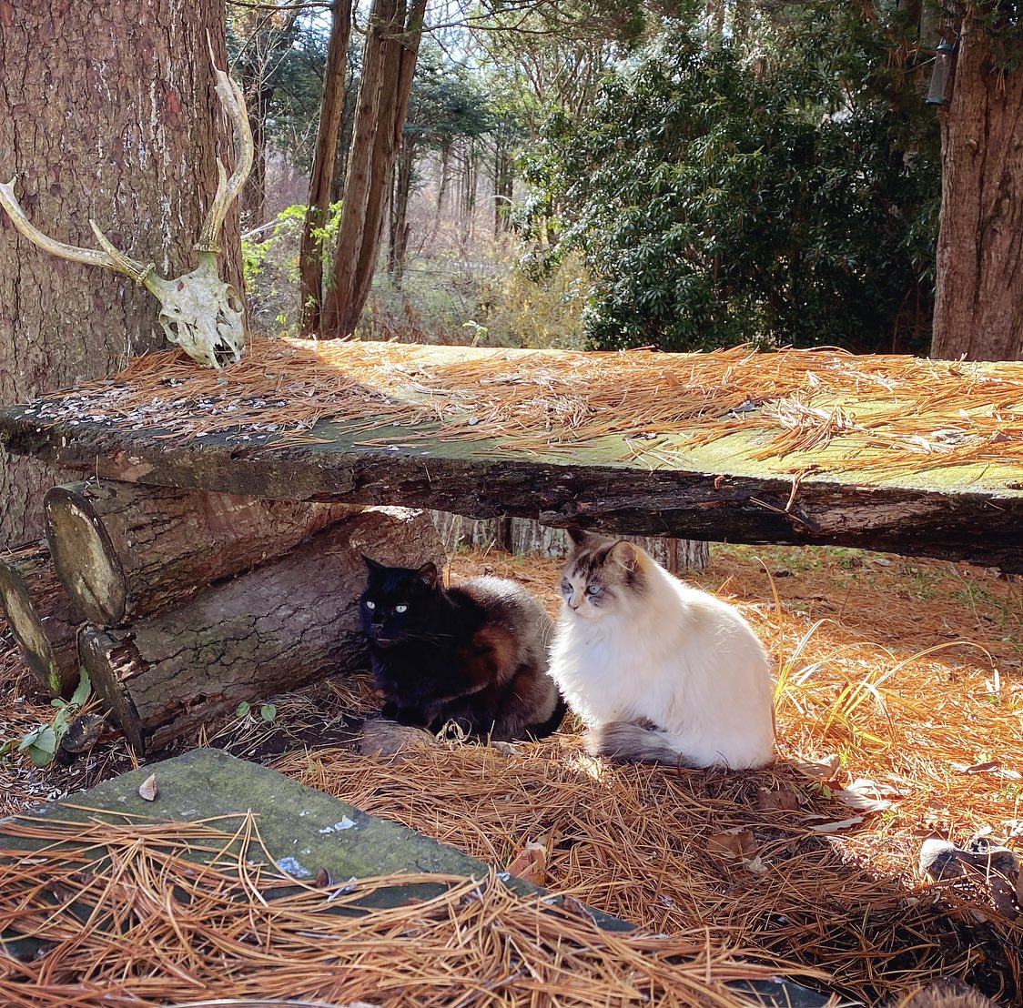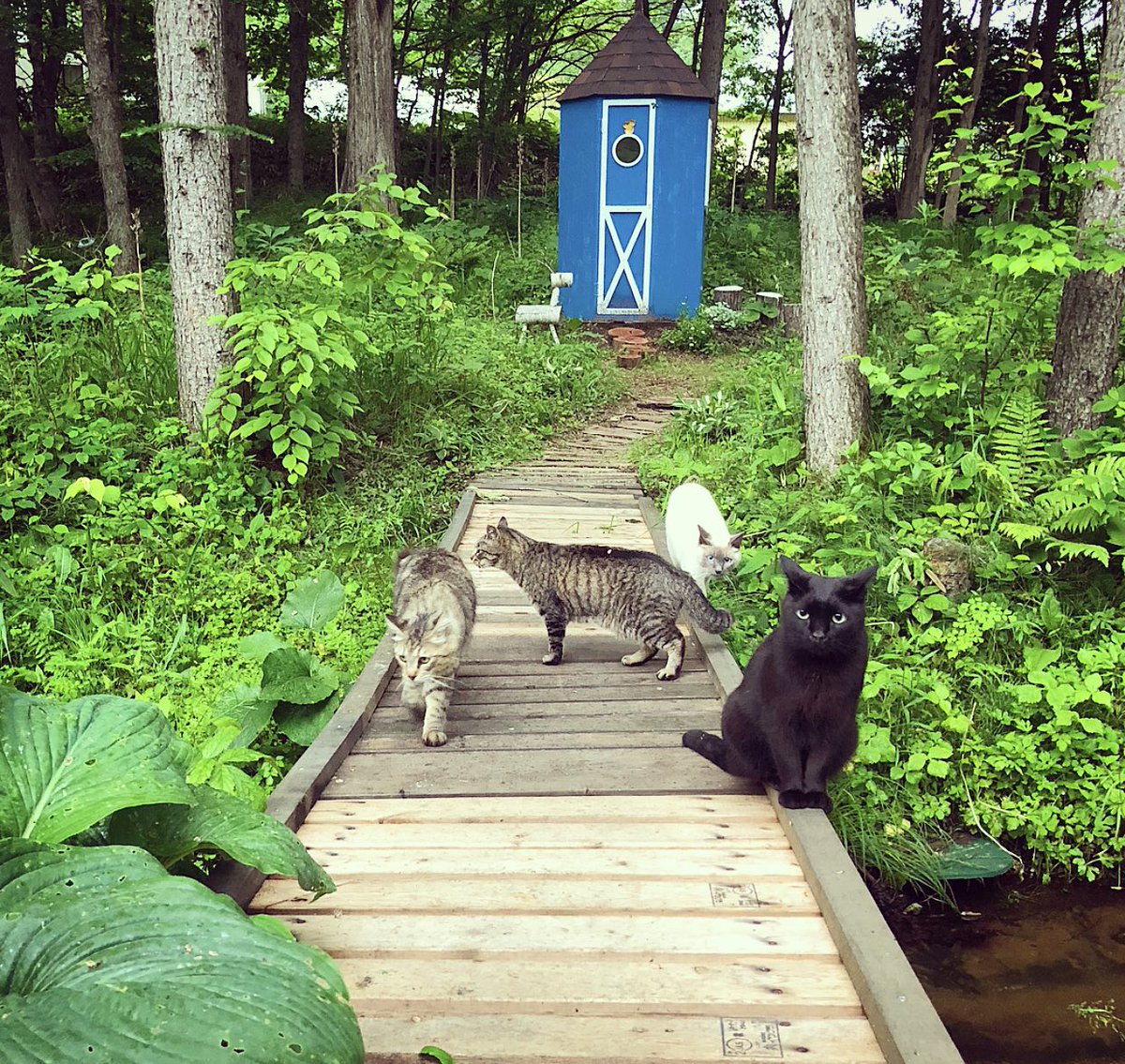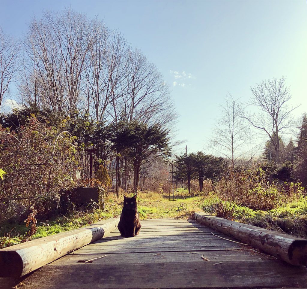 少し気温が上がった日。母屋前の小川にかかる橋は猫たちお気に入りの日向ぼっこ場所。