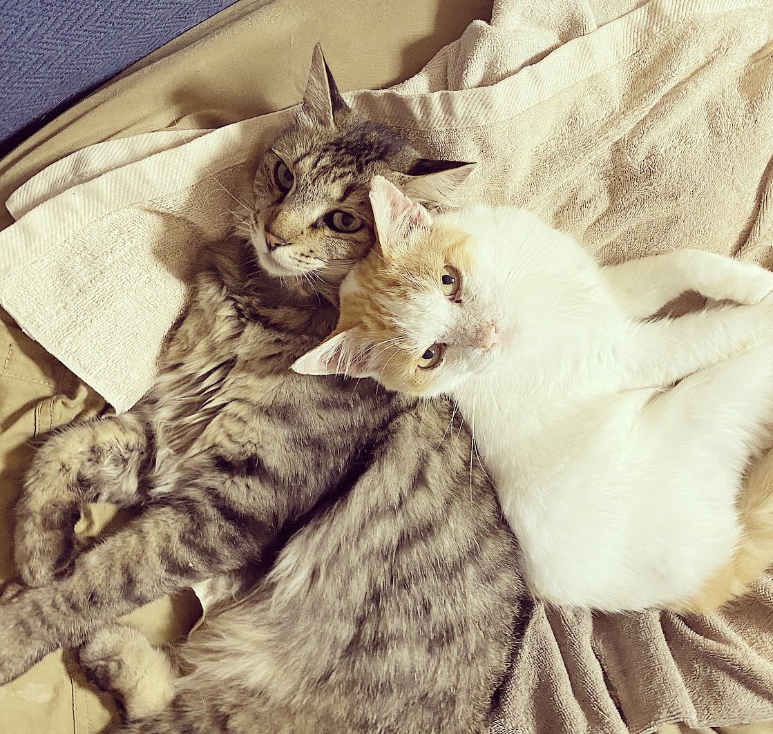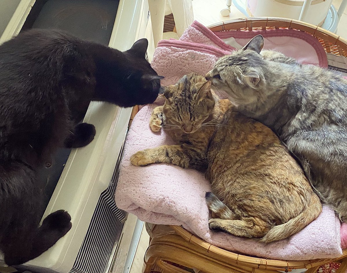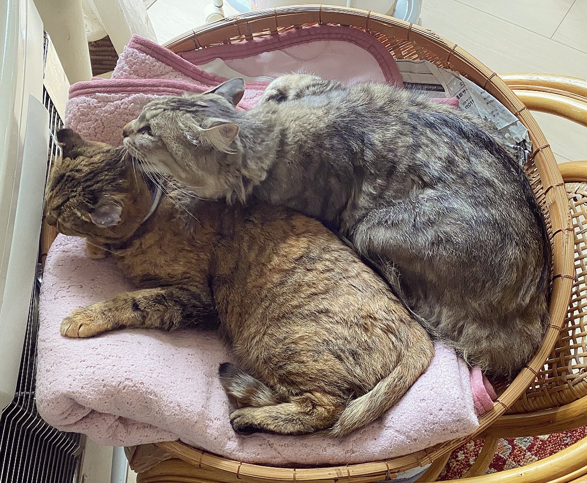 気温も低め。着いていないストーブの前で添い寝にゃんこ。 大好きなチャチャをファーファにとられて(๑φдφ)ぼくも!ぼくも一緒にねるーー!の黒猫。