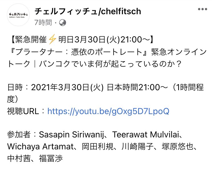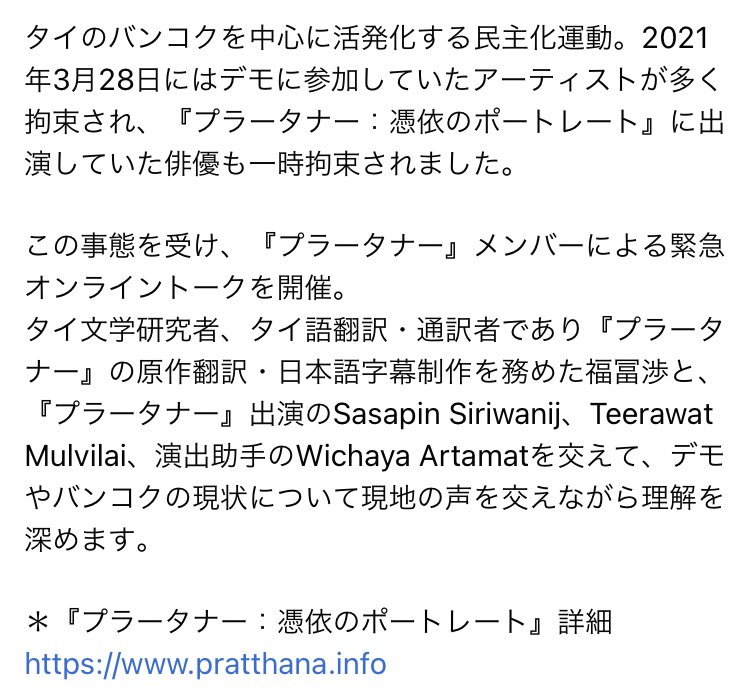 バンコクでのアーティストたちの逮捕について、本日夜緊急オンライントークに登壇します。『プラータナー』出演のプーペ、カゲ、演出助手のベスト(『父の歌』演出)、岡田利規さん、川崎陽子さん、塚原悠也さん、中村茜さんと、現地の状況を考えます。