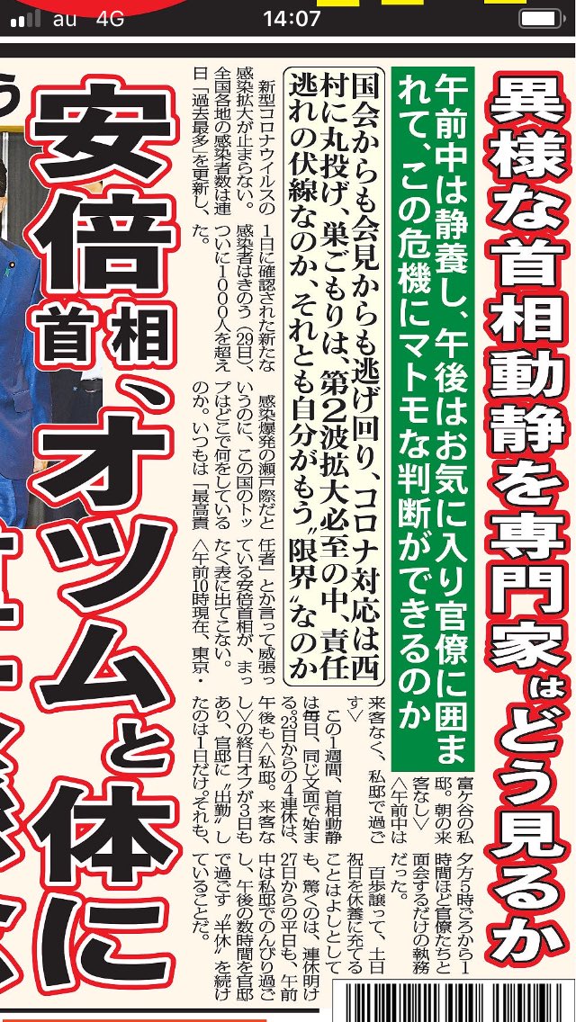 会見では、次なる流行に備えて「先頭に立って努力をしていく」と強調していたはずだが、最近の首相動静を見る限り、先頭に立って努力するどころか都内の私邸で引きこもり状態だから呆れてしまう。 nikkan-gendai.com/articles/view/…