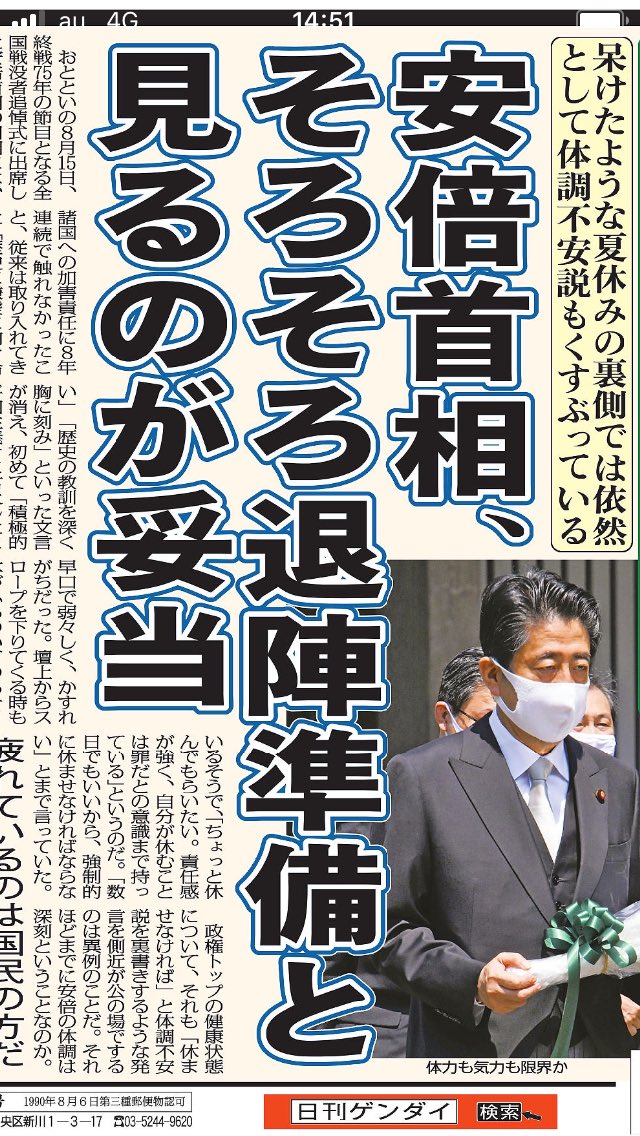 これ以上つづけても良いことはない、むしろこれまでの失政の責任をとらされると判断し、「体調悪化で辞任」するべく今必死になって周囲が布石を打っているのではないのか。 lite-ra.com/2020/08/post-5…