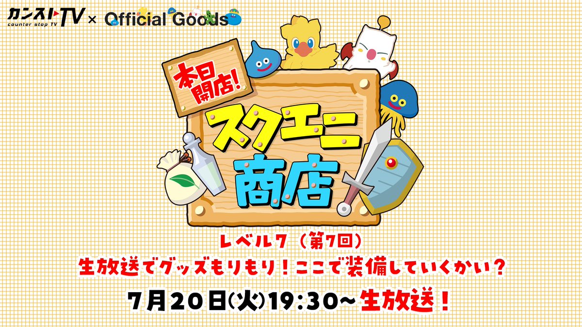 『本日開店!スクエニ商店』7回目の放送が決定!今回は7月27日(火)発売予定「新すばらしきこのせかい 発売記念くじ」の各賞をご紹介!その他、ファイナルファンタジーやドラゴンクエストの新作グッズのご紹介も!盛りだくさんの内容でお届けいたしますので是非ご覧ください♪sqex.to/skE7W