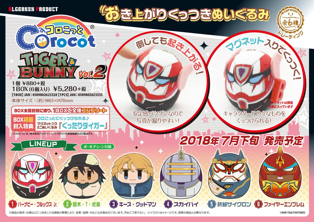 アルジャーノンプロダクトの「TIGER & BUNNY コロこっと Vol.2」が案内開始となりました。7月下旬発売予定、初回BOX特典は「ぐったりタイガー」です。アニメ関連ショップ他にてご予約ください。Vol.1も好評受付中! #tigerbunny