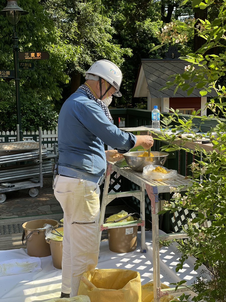 美術の吉田さん、本日は「あるくの大すき」のトトロをレタッチ中です。たくさん子どもたちにさわってもらい薄くなってきたトトロのお化粧直し。
