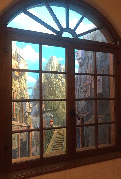 本日21:00からの金曜ロードSHOW!は「天空の城ラピュタ」です。館内には屋上庭園など作品の世界を感じられる場所がありますが、画像は地下1階男性用トイレのニセ窓から。パズーとシータがドーラ一家とおっかけをするスラッグ渓谷です。今夜はぜひお楽しみください。