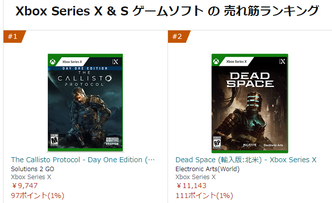 AmazonのXbox Series X & S ゲームソフト の 売れ筋ランキングにて、海外版カリストプロトコルとDead Spaceが1位・2位に揃ってランクイン中。