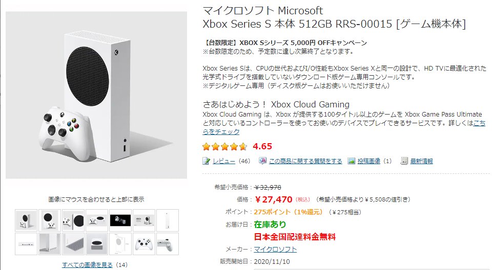 「Xbox Series S」なんと5000円オフキャンペーンが再びスタート!Amazonやヨドバシにて27470円で販売中。台数限定のためお早めにどうぞ。