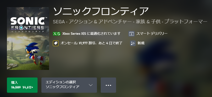 「ソニックフロンティア」なんと早くも30%オフの4612円でセール初登場。セール期間が残り4日と短めなのでゲットはお早めに。
