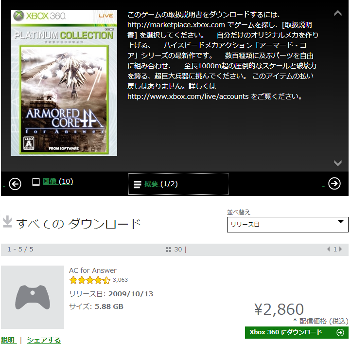 アーマード・コア過去作が一部で高騰しているようですが、Xbox360ストアでは4体験版、fA体験版、fA本編が購入可能です。(※プレイにはXbox360本体が必要です)