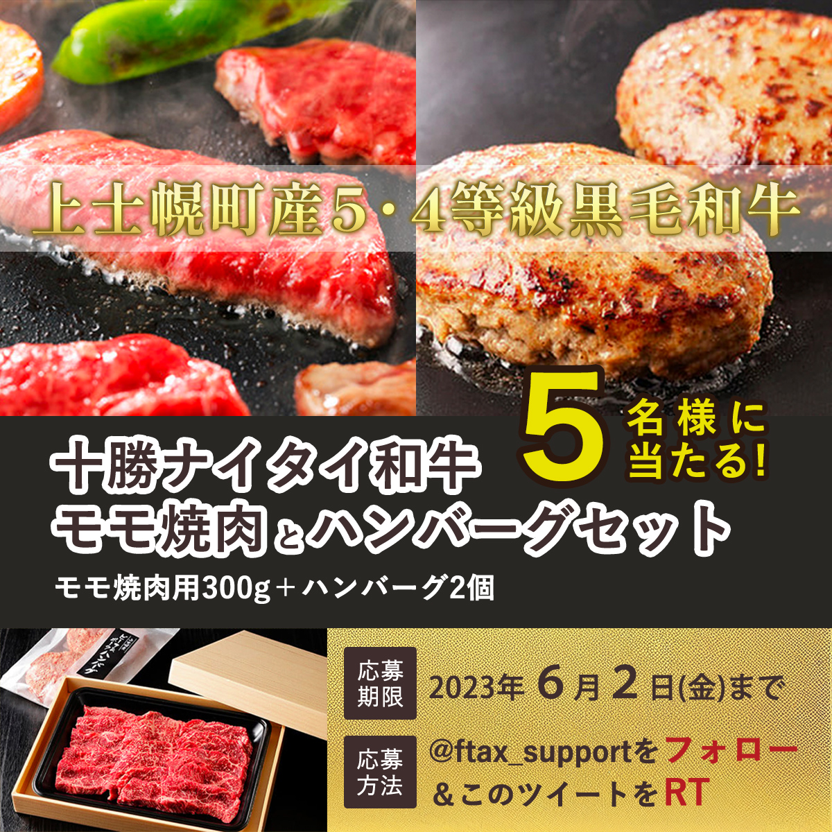 今日は月に一度の #肉の日 ということで、フォロー&RTで、上士幌産5・4等級黒毛和牛「十勝ナイタイ和牛」が抽選で5名様に当たります♪楽天レビュー4.9超の絶品ハンバーグ付きです!