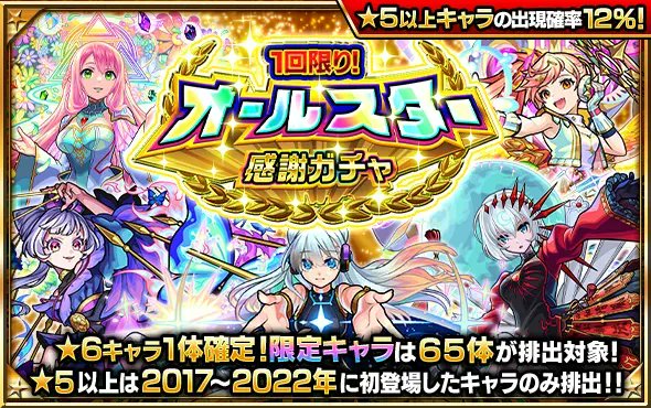 ただいま期間中1回のみ引ける「オールスター感謝ガチャ」開催中!