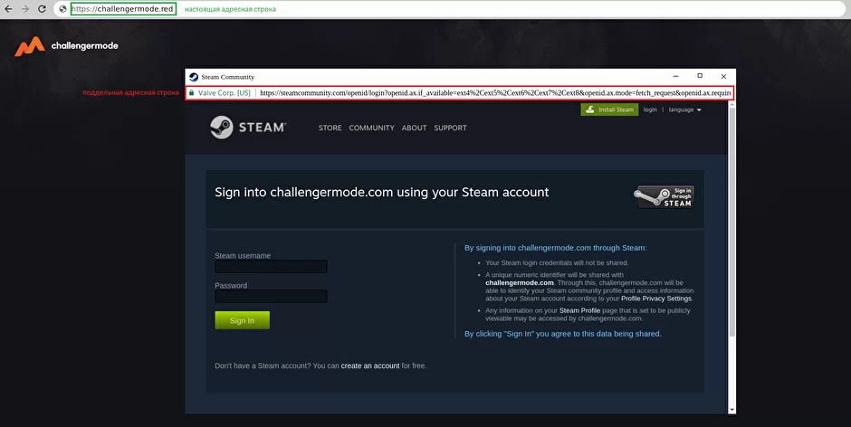ポップアップウィンドウで偽のSteamアカウント情報の入力画面を表示し、SSL証明やURLによる判別が難しくなっています。大切なアカウント情報を奪われないようご確認を。