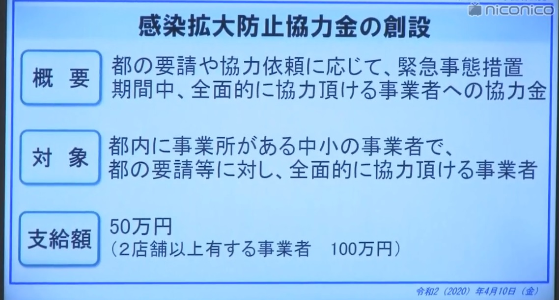 小池都知事は緊急事態宣言に伴う休業要請の概要を記者会見で発表。要請に協力する事業者への協力金を出すことを表明しました。