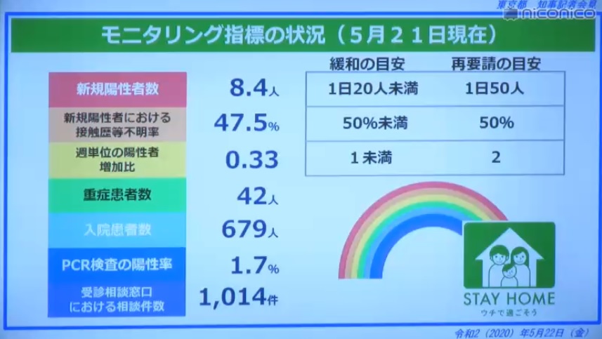 小池都知事は会見で、新型コロナウイルスの感染状況をモニタリングする7つの指標を象徴する7色のライトアップをレインボーブリッジで実施と発表。施設の休業要請緩和のステップも説明。