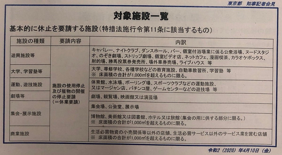5月6日までキャバレー、性風俗店など遊興施設、大学・学習塾、運動・遊技施設、劇場、などを対象