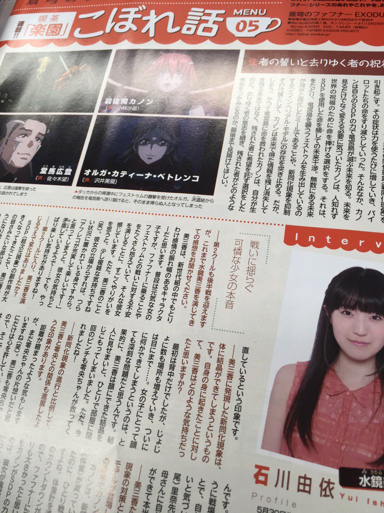 さらに!「アニメディア」12月号では、喫茶“楽園”連載企画☆水鏡美三香役の石川由依さんのインタビューが掲載!「蒼穹のファフナー」音楽劇より参加されている石川さんだからこそ語れること、想いをお話しいただきました!#fafner