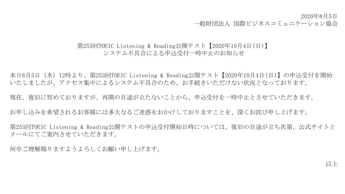 新型コロナウイルス感染拡大の状況により、6月28日(日)に実施を予定しておりましたTOEIC Listening & Reading公開テストを、全国すべての会場で中止することといたしました。