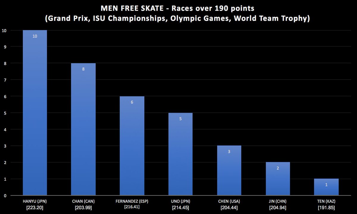 Only 7 skaters have reached at least 190 points in the free skate. #YuzuruHanyu is the first with 10 times. No one else went over 185.
