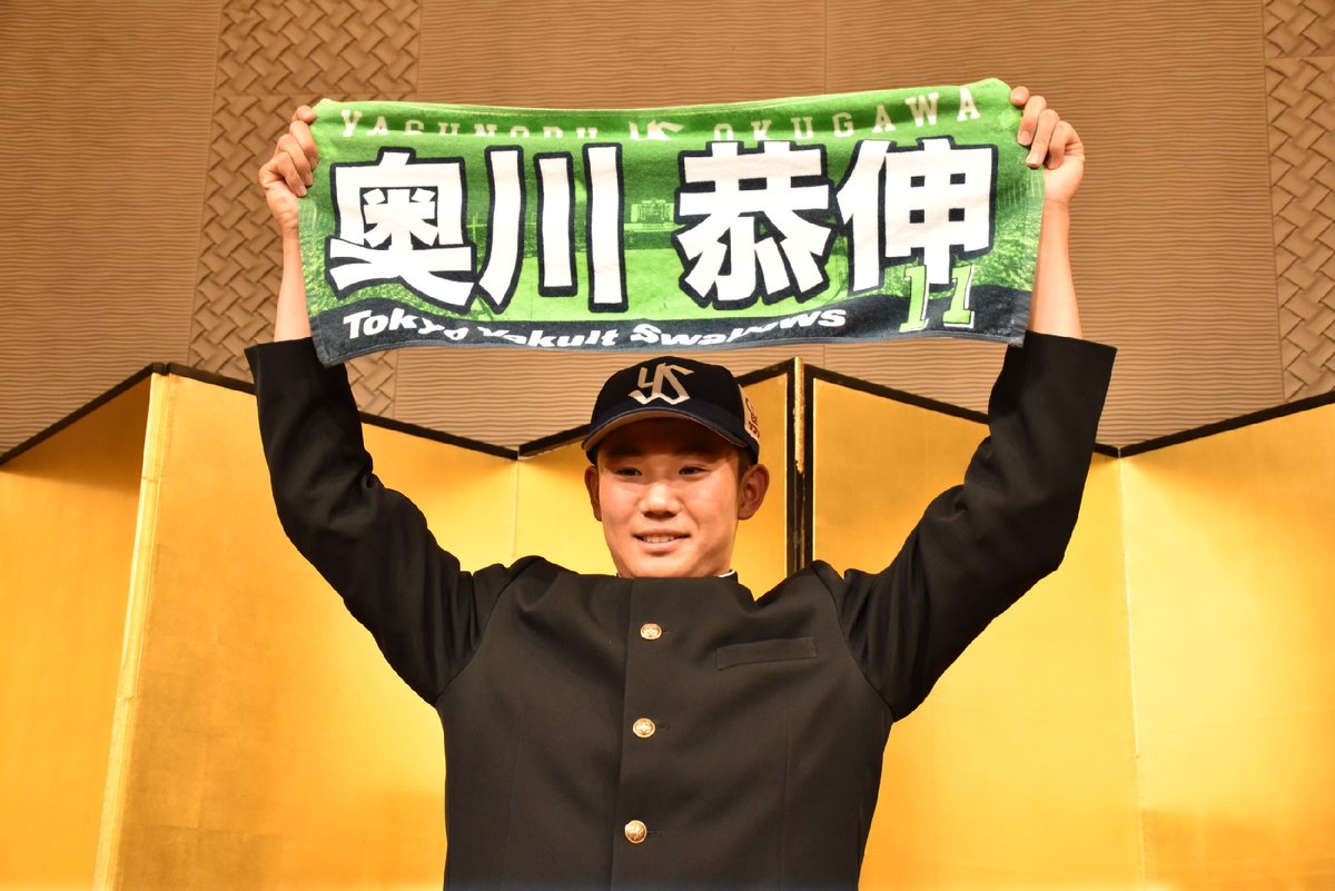 ヤクルトのキャップをかぶった #奥川恭伸 投手。見慣れた笑顔とともに、この姿もファンに愛されるでしょうね。