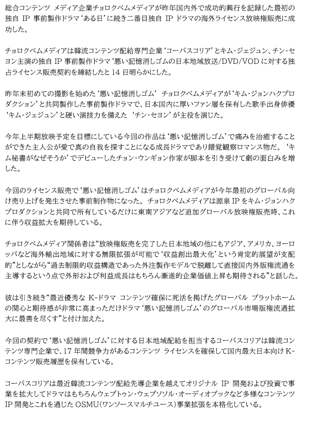 キム・ジェジュン、チン・セヨン主演の独自IP事前製作ドラマ‘悪い記憶消しゴムの日本地域放送/DVD/VODに対する独占ライセンス販売契約を締結したと14日明らかにした。