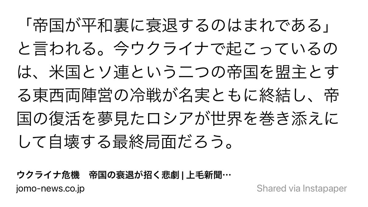 @Yuichi_Hosoya 「ロシアに領土の一部をうばわれ、1956年以降、ながく4つの島を返してほしいと交渉してきたが、なお日露平和条約を結ぶにいたっていない。だから日本はこのたびの戦争に仲裁者として介入するのにふさわしい存在である。」→この論理的飛躍が一切解せません。