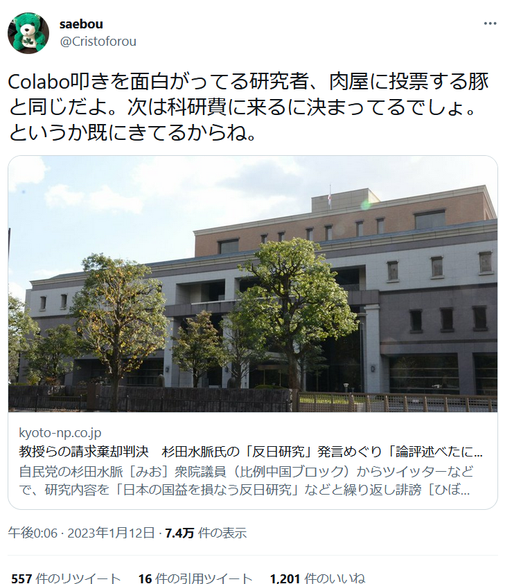 助成金、つまり税金の使われかたに疑問を呈する学者さん達を「肉屋に投票する豚」との比喩表現にはぎょっとしますね。それだけ手を入れられたくないのでしょう。よほど科研費の報告が雑か、または便宜を図ってもらっているのだろうと推測します。 twitter.com/itagaki_katsu/…