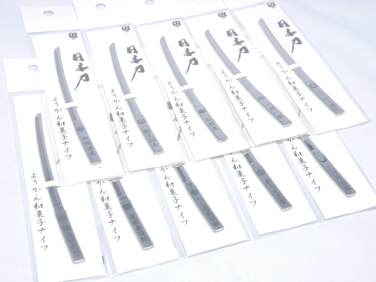 羊羹切日本刀ナイフ好評で品切続出。感謝します。続いて予約販売を開始します。黒い羊羹切光忠(燭台切光忠)、龍入り大倶利伽羅廣光、羊羹切宗近(三日月宗近)、羊羹切国永(鶴丸国永)、羊羹切膝丸です。限定100個の予定、3年くらいは復刻なしですのでお買逃しなくu0u0.net/Qp6b