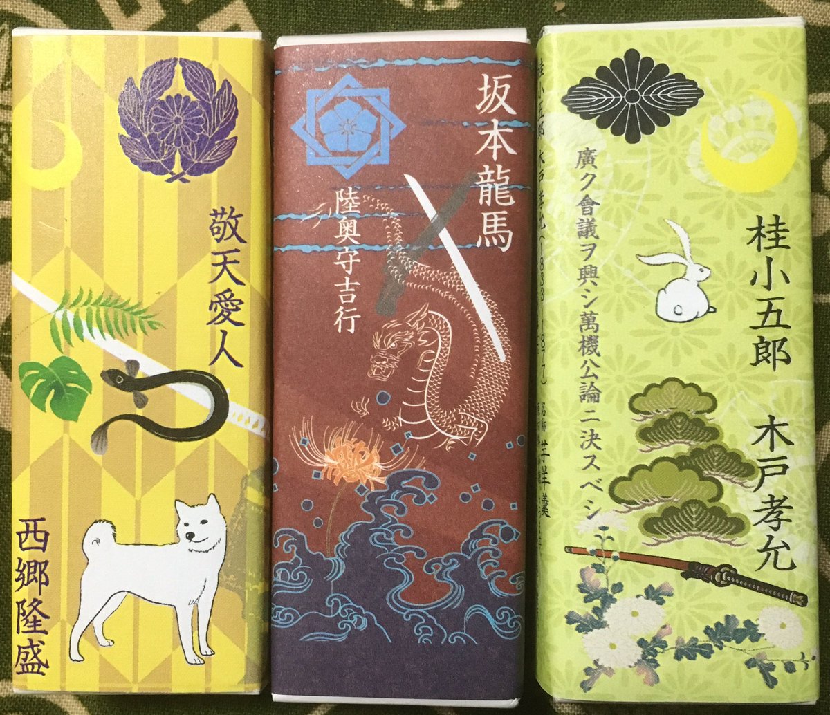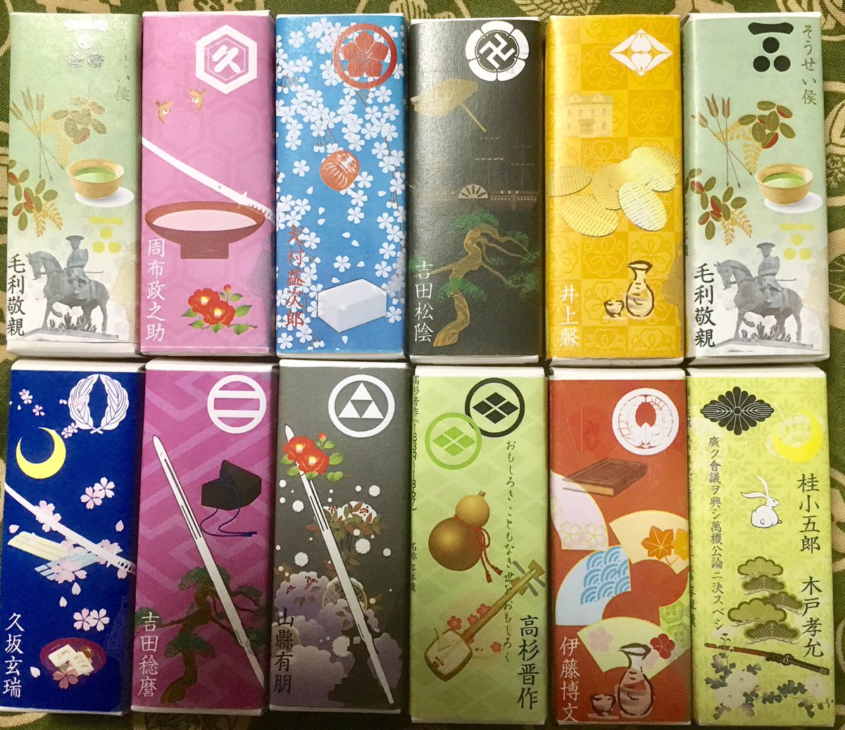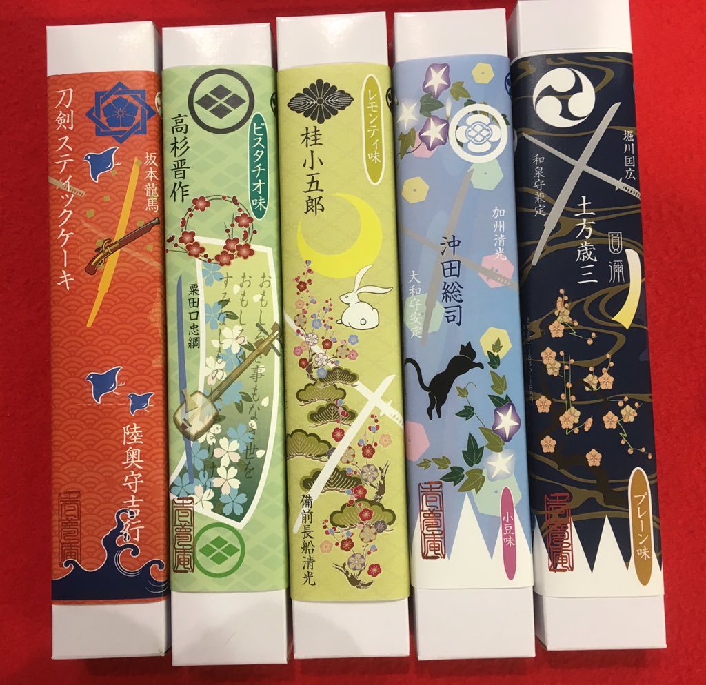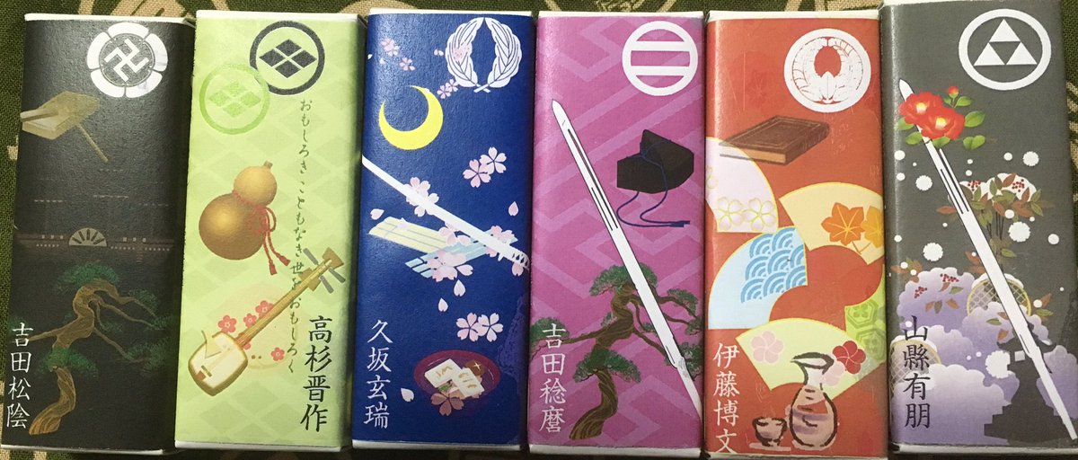 毛利敬親展(7/13-8/26山口県立美術館で開催中)にて長州藩士パッケージの羊羹を販売しています。毛利敬親、吉田松陰、周布政之助、大村益次郎、高杉晋作、桂小五郎(木戸孝允)、久坂玄瑞、伊藤博文、井上馨、山縣有朋、吉田稔麿と薩長同盟に因んで西郷隆盛、坂本龍馬も。#毛利敬親展