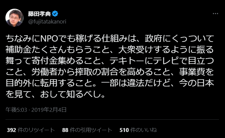 会計でガタガタ言われたくないなら税金を貰わずに自腹でやれば良いのに。 twitter.com/fujitatakanori…