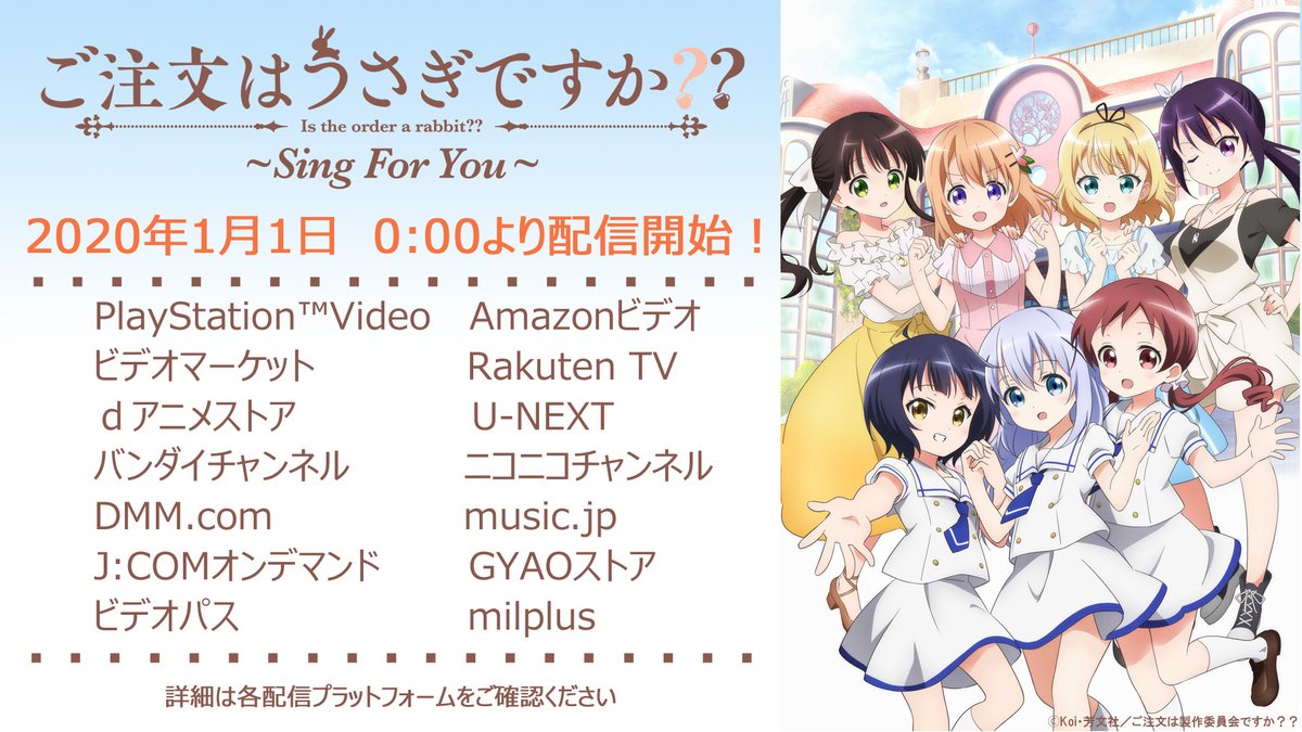 本日20:00よりAbemaTVにてOVA「ご注文はうさぎですか?? ~Sing For You~」発売記念!「ご注文はうさぎですか?」全羽一挙放送がスタート♪可愛さをたっぷりブレンドした時間をお楽しみください☆ abema.tv/channels/anime… #gochiusa