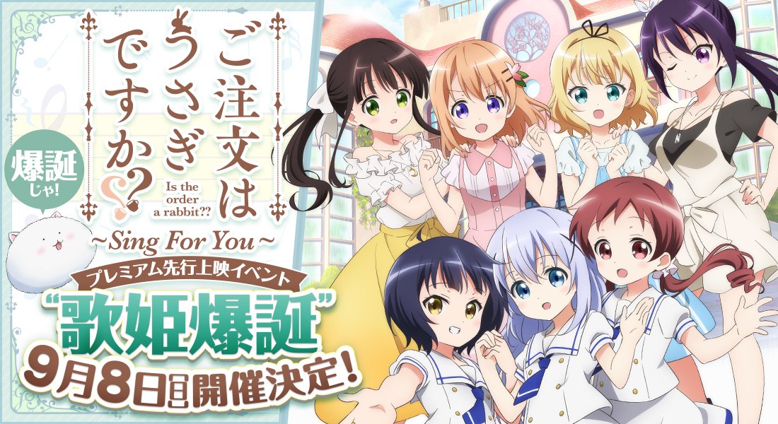 本日、8月3日12:00より9月8日開催の「ご注文はうさぎですか??~Sing For You~」プレミア先行上映イベント“歌姫爆誕”ライブビューイングのプレリクエスト抽選先行の受付がスタートしました!スペシャルなイベントをお見逃しなく☆gochiusa.com/news/n07490000… #gochiusa