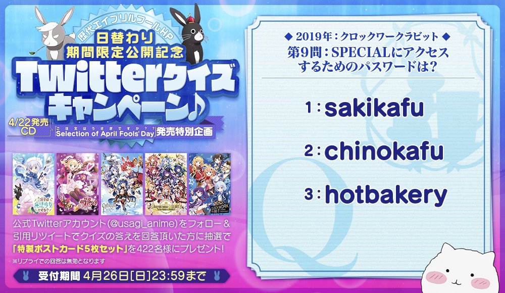 【4/22 エイプリルフールCD発売記念Twitterクイズ⑨♪】公式Twitterアカウントをフォロー&引用リツイートでクイズの答えを回答頂いた方に抽選で「特製ポストカード5枚セット」を422名様にプレゼント♪(リプライでの回答は無効になります)ぜひチャレンジしてください☆今回の問題はコチラ! #gochiusa