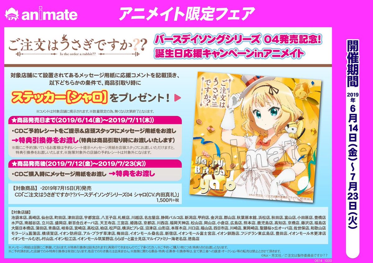 『ご注文はうさぎですか??バースデイソングシリーズ04』発売記念!誕生日応援キャンペーンinアニメイト開催決定!店舗にて応援コメントを記載し『バースデイソングシリーズ04 シャロ』をご購入の方にシャロステッカーをプレゼント☆詳細は公式HPをご覧ください♪ gochiusa.com/news/hp0001/in…