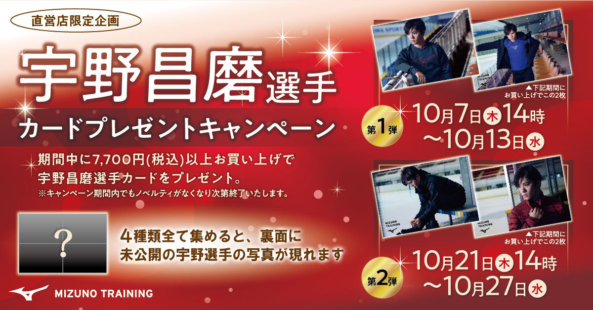 【ミズノ公式オンラインショップ】宇野昌磨選手カードキャンペーン第2弾は終了しました!!ありがとうございました。“4枚そろえてお写真現れる”企画はいかがでしたでしょうか?今シーズンも宇野選手を一緒に応援よろしくお願いいたします。 twitter.com/mizunoshop/sta…