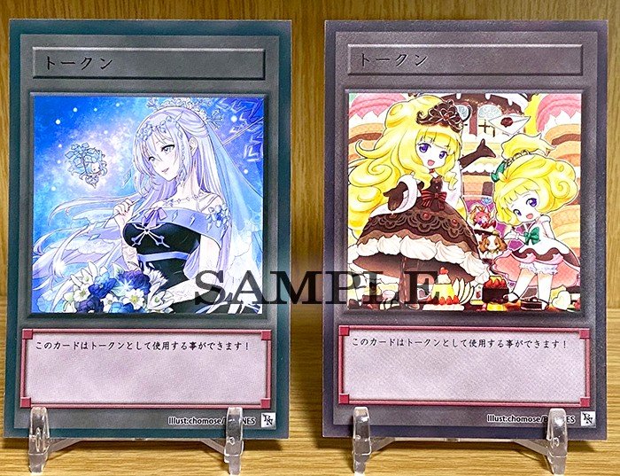 BOOTHで頒布予定のスリーブの現物になります! スリーブ1個につきおまけトークン1枚同梱! 枠のみメタリック仕様です✨