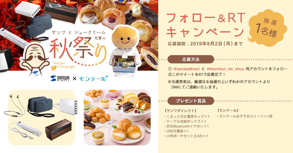 シュークリーム先輩( @monteur_mr_shuu )とサンワダイレクト( @sanwadirect ) をフォロー&このツイートをRT!