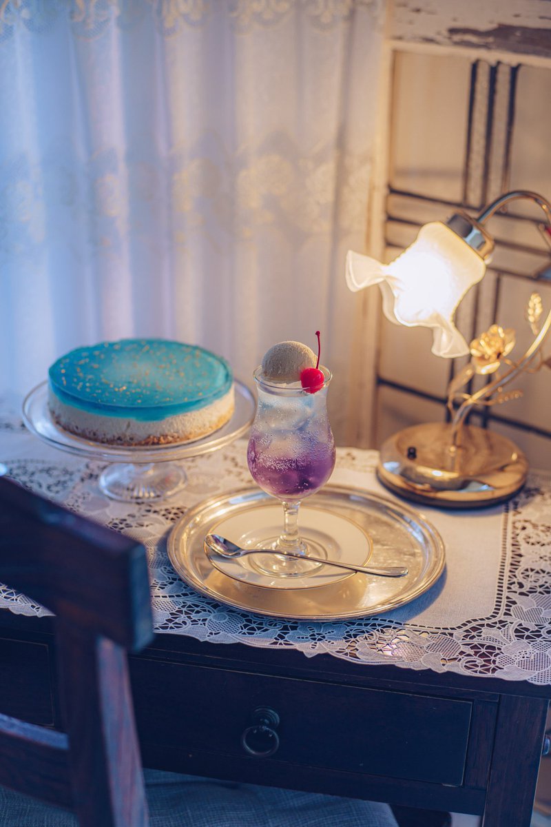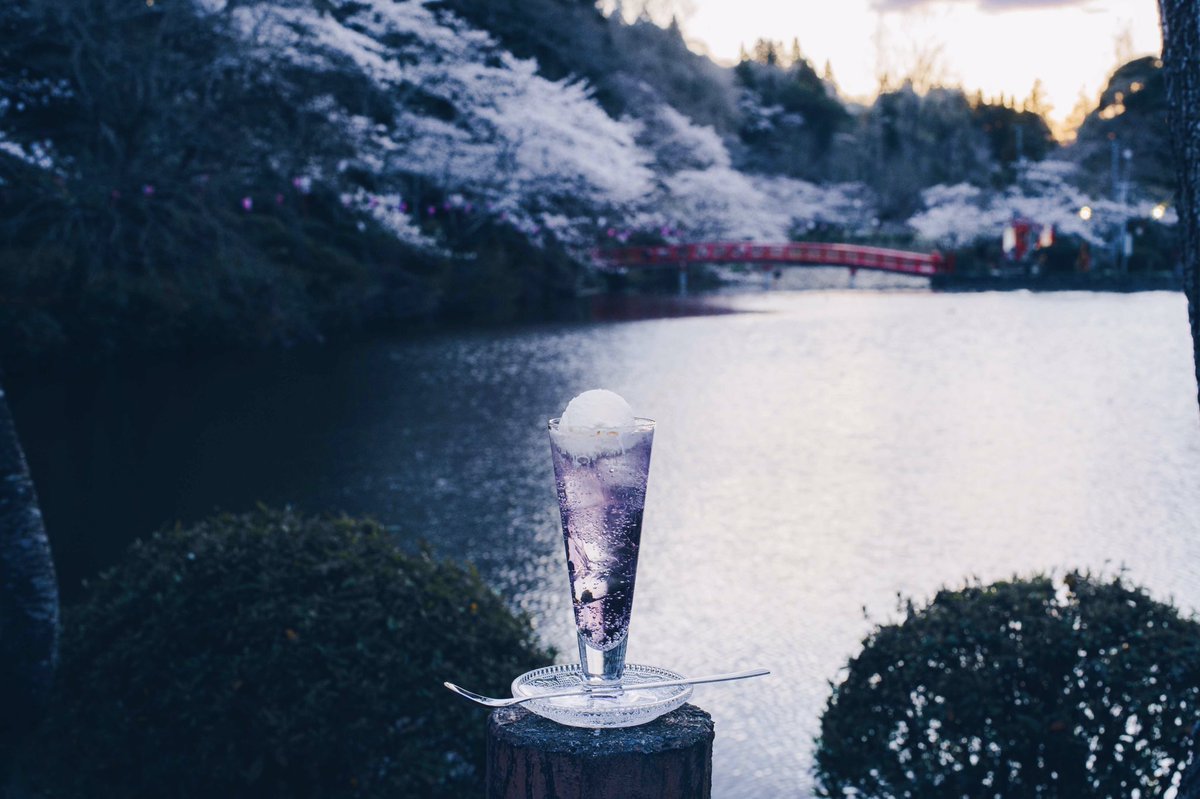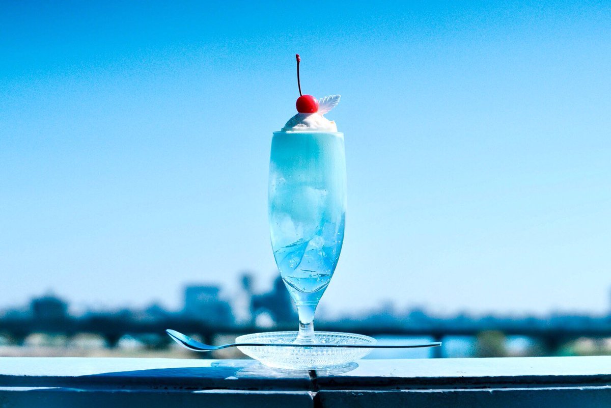 二藍のクリームソーダ。 日本の色を表す言葉に二藍という言葉があります。藍色と花色を重ね合わせた色の名で、少しずつ青くなる頃の世界の色と淡い桜の色の重なりを美しいと思ってしまいました。