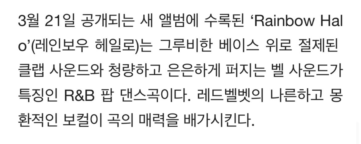 [INFO] 220315 'Rainbow Halo' เป็นเพลงป๊อปแดนซ์ R&B ที่มีเสียงปรบมือที่ชัดเจน มีเสียงกระดิ่งที่นุ่มนวลและสดชื่นในเสียงเบสที่หนักแน่น มีเสียงร้อง Red Velvet ที่ชวนฝันซึ่งเป็นเสน่ห์เพลงคูณสองเท่า