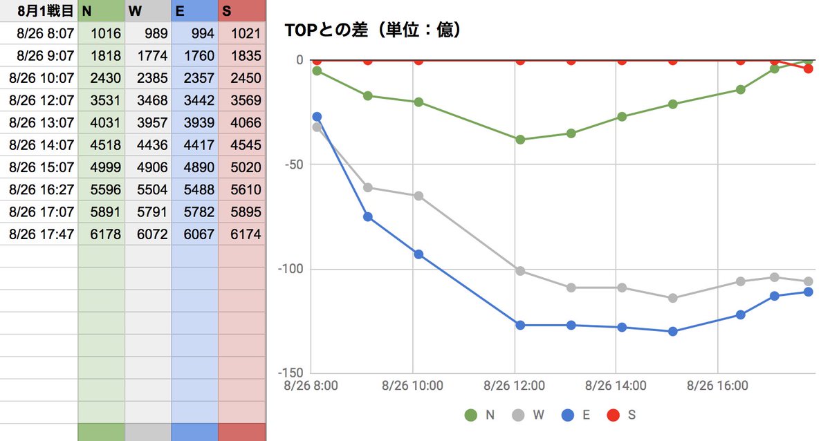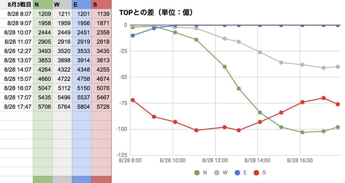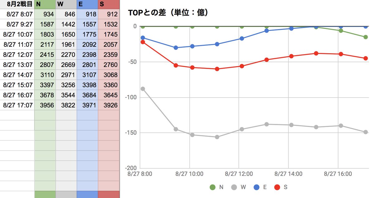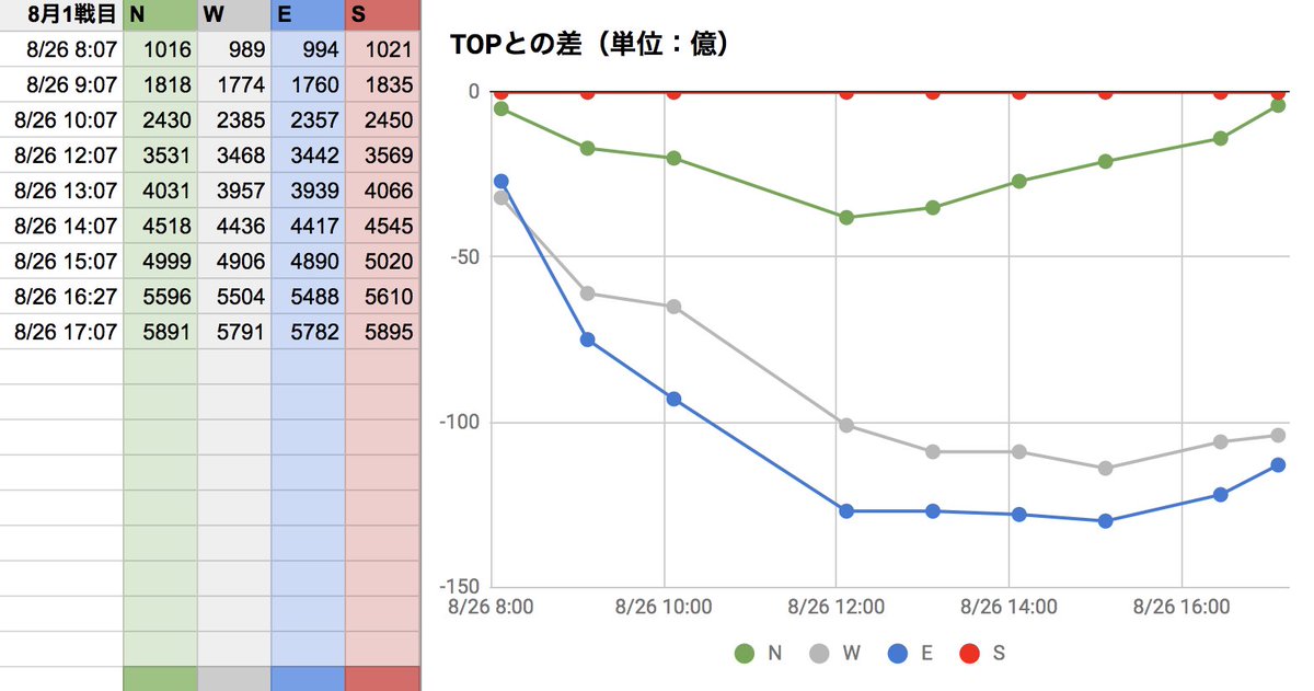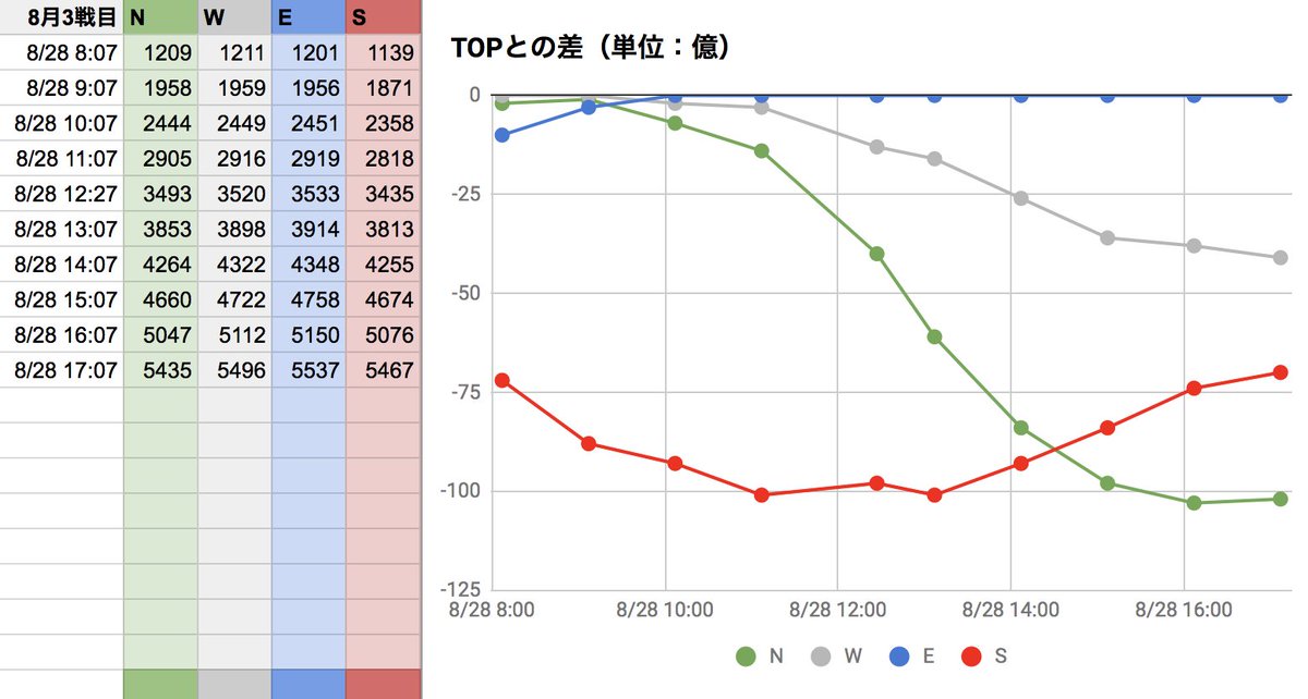 8月古戦場3日目。現在EがTOPですが、午前中最下位だったSが追い上げてますね。面白い展開です!