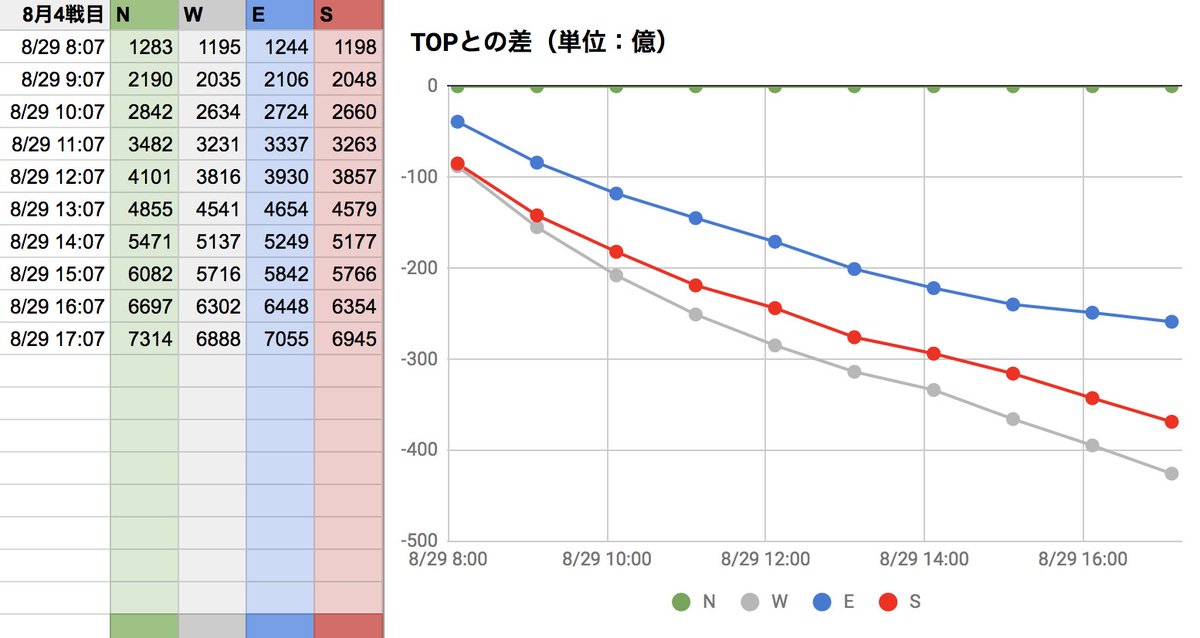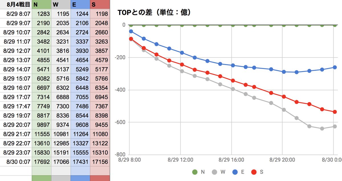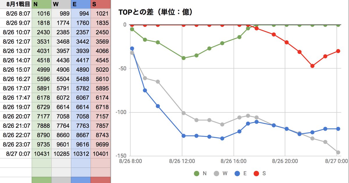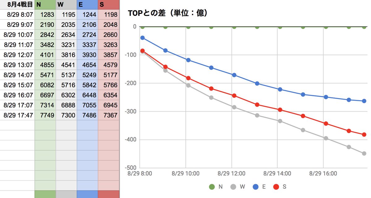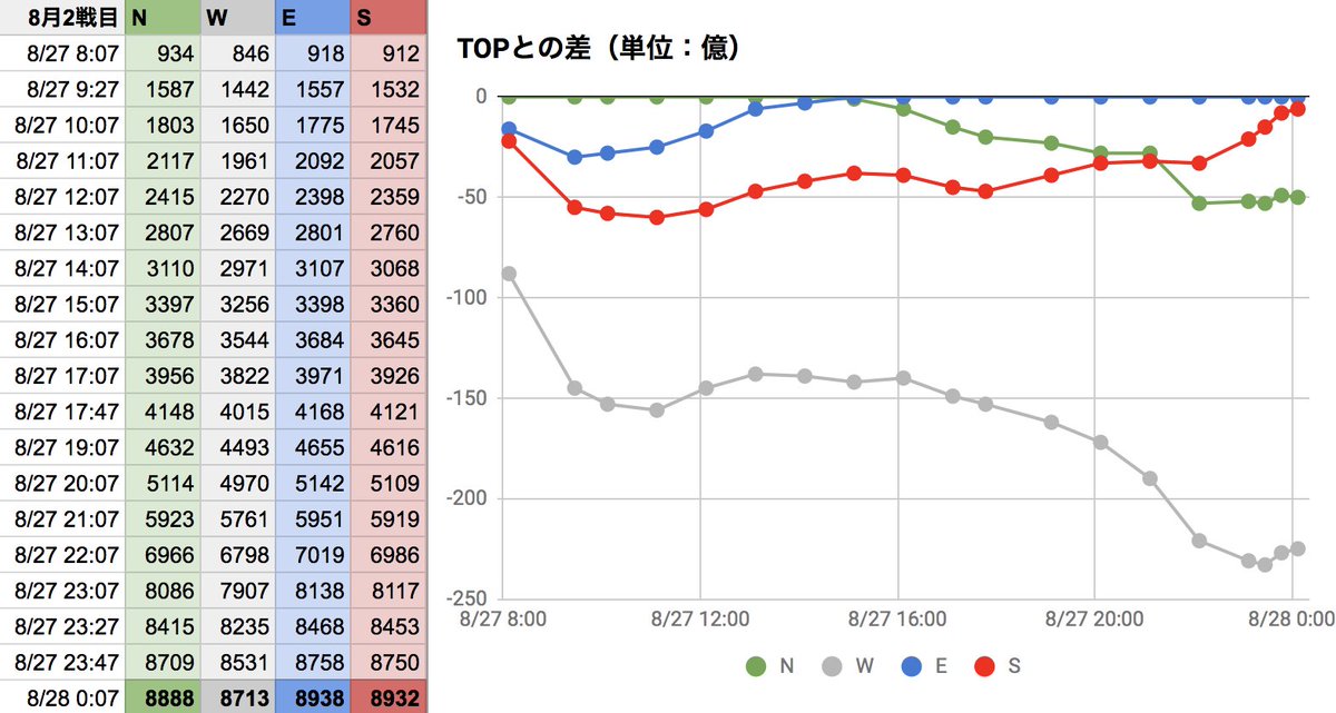 8月古戦場3日目。現在EがTOPですが、午前中最下位だったSが追い上げてますね。面白い展開です!