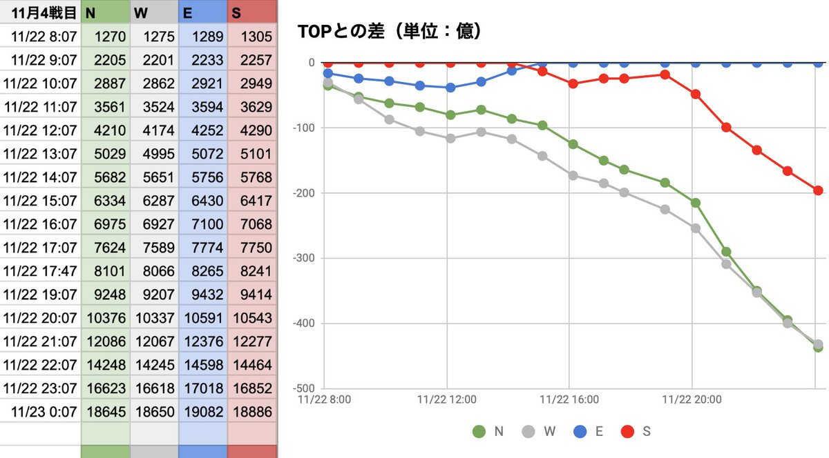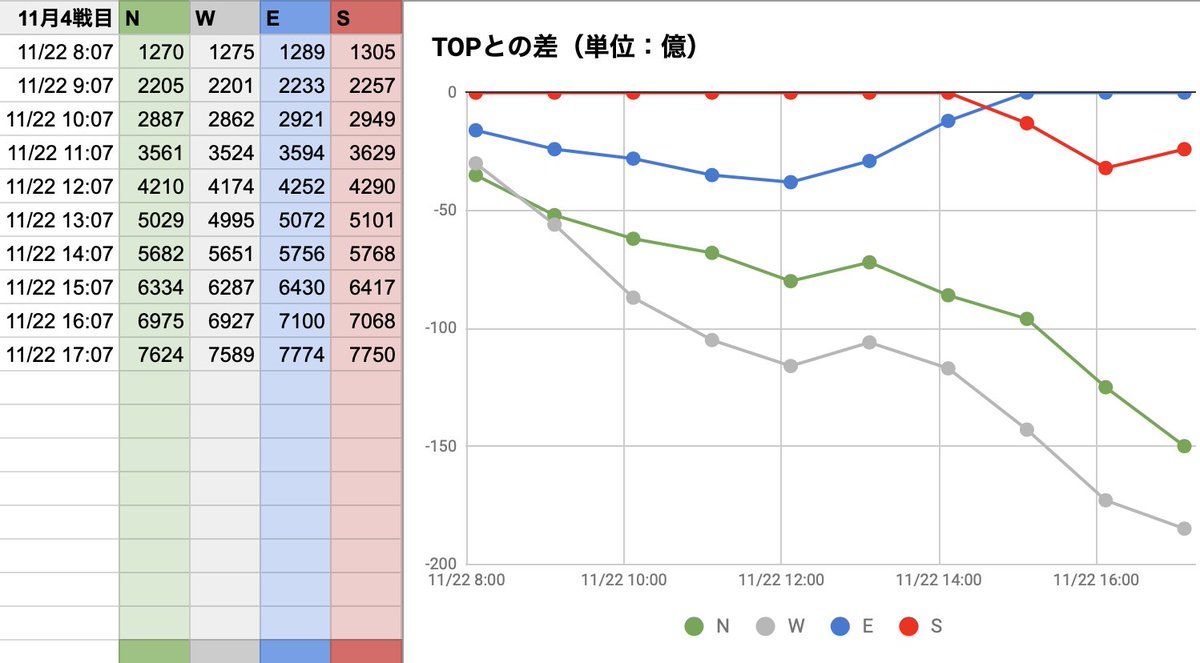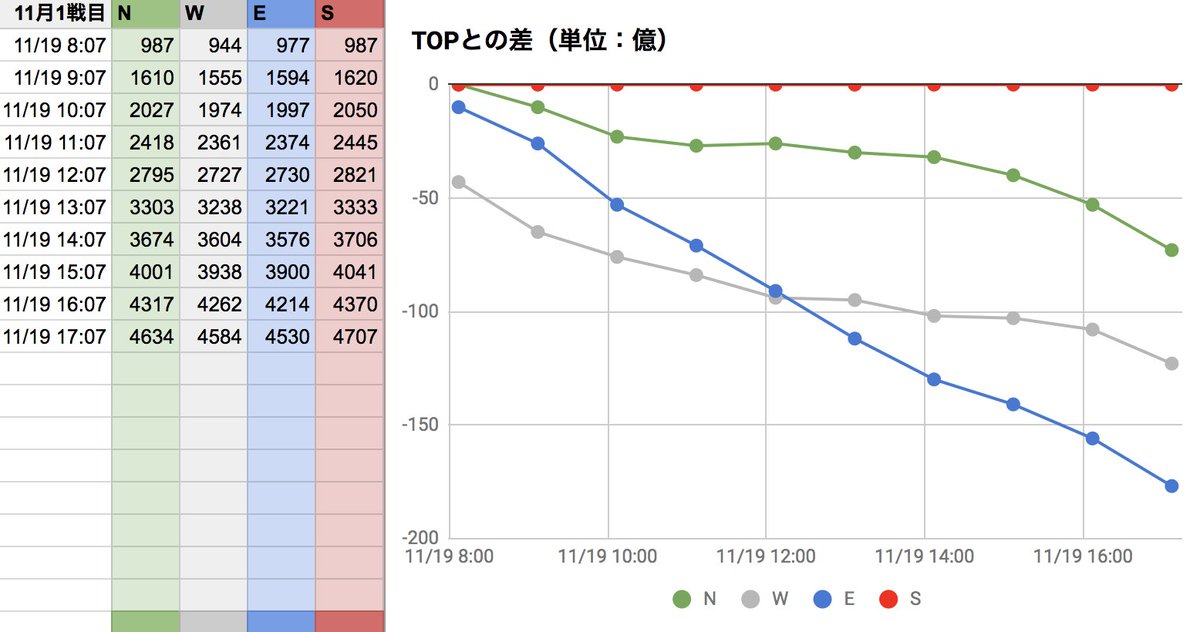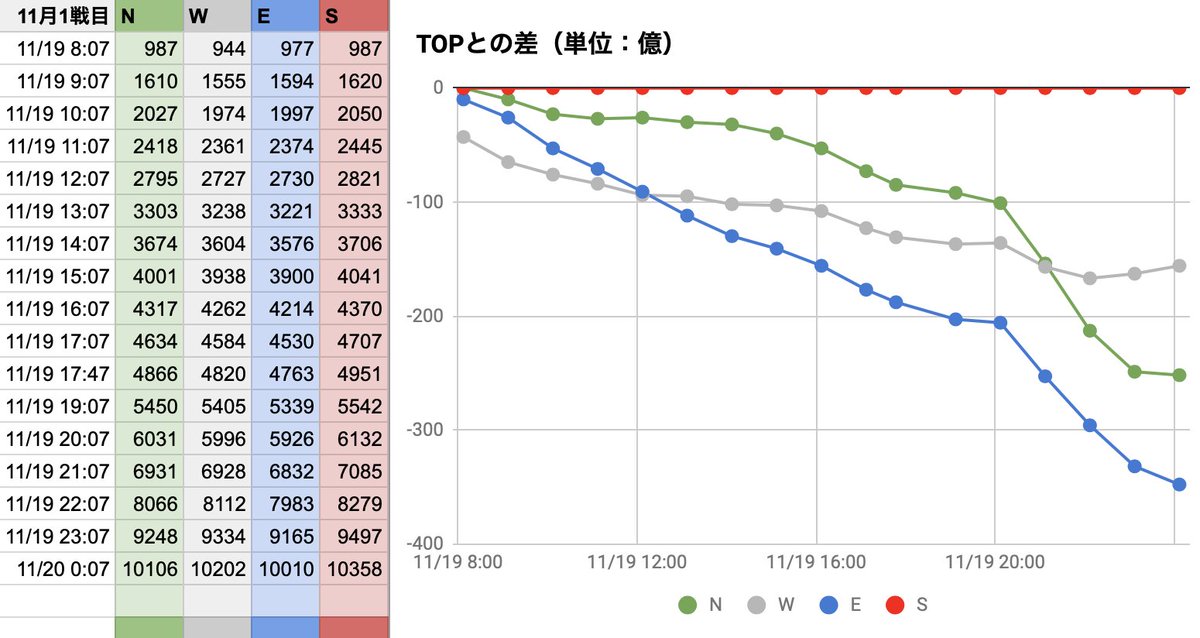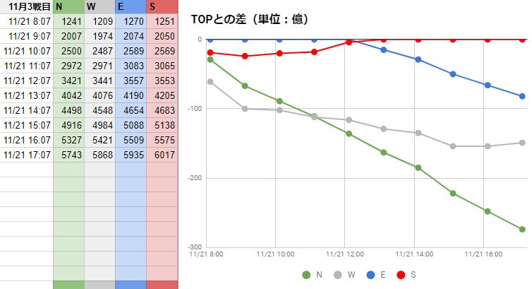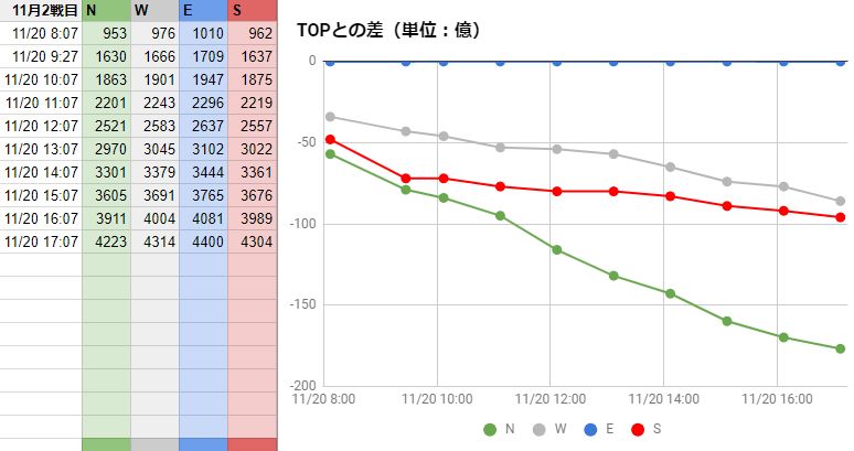 11月古戦場2日目。E独走、WとSの2位争いの様相です。